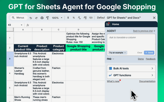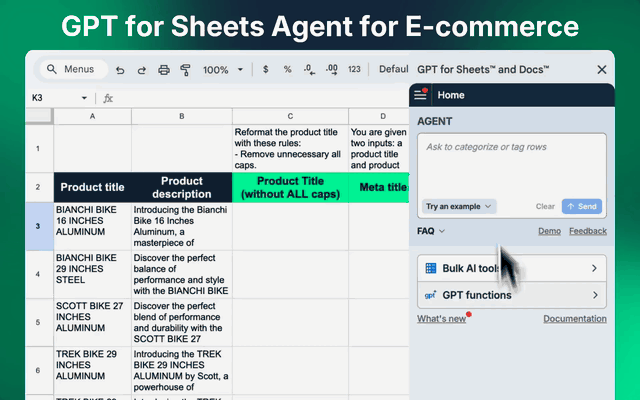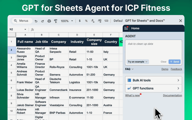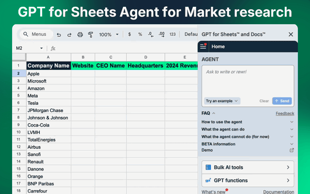 Equipos en comercio electrónico, SEO, adquisición pagada, ventas salientes, investigación de mercado y análisis de retroalimentación utilizan GPT para Sheets para convertir miles o incluso cientos de miles de filas en flujos de trabajo completamente automatizados. El Agente está optimizado para rendimiento masivo, manejando hasta alrededor de 360 solicitudes por minuto, hasta unas 200,000 filas por ejecución, y entregando hasta 10,000 resultados potenciados por IA por hora, a menudo más de 1,000 veces más rápido que el trabajo manual, mientras sigue siendo lo suficientemente fácil para usuarios no técnicos. Los usuarios avanzados aún pueden recurrir a funciones GPT en celda para casos especiales, pero la experiencia principal está impulsada por el agente a través de una barra lateral intuitiva.