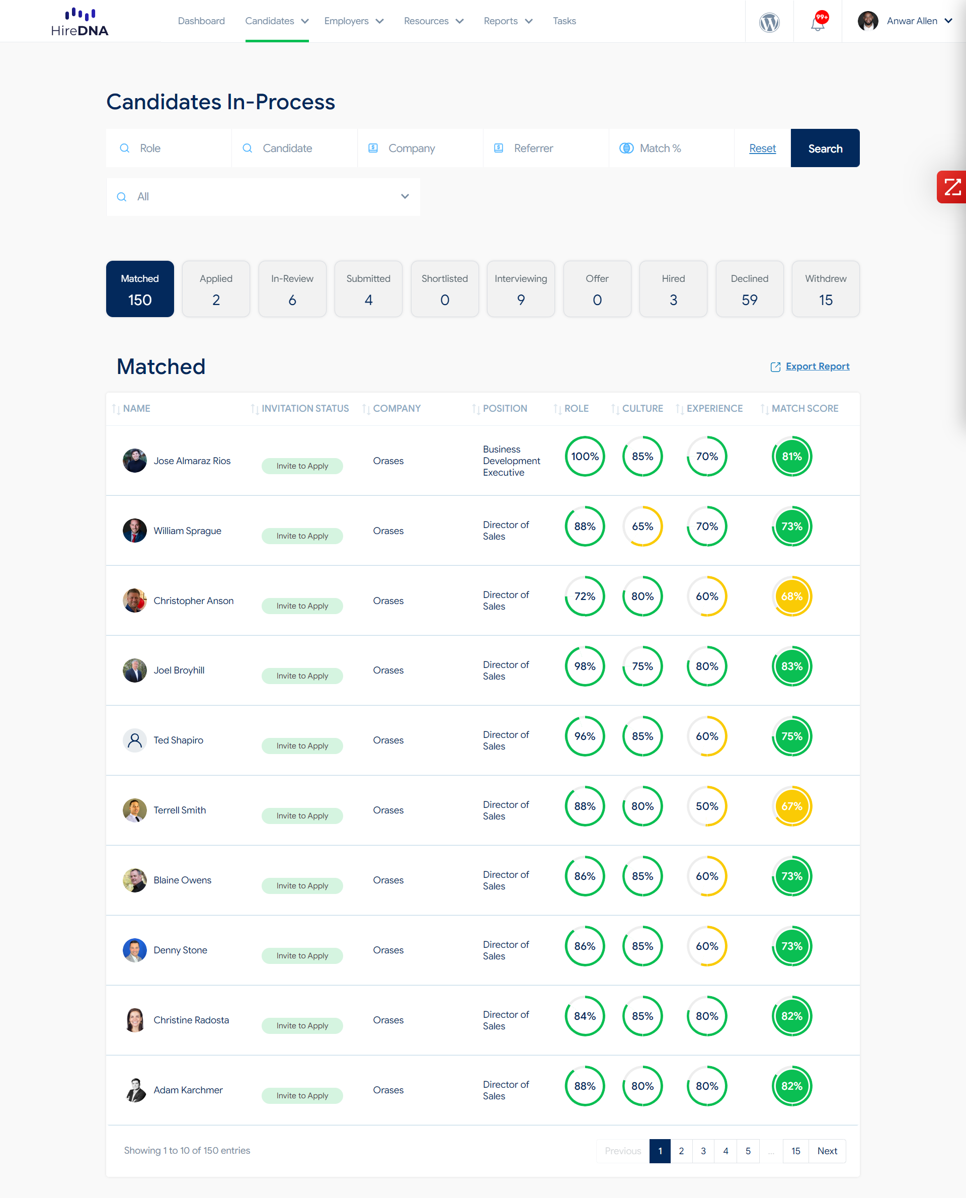 Desde el momento en que Anwar se acercó presentando una oportunidad, supe que iba a tener una gran experiencia. El profesionalismo fue del más alto grado y fue un proceso fácil para algo que típicamente es desalentador. Cada proceso y paso fue transmitido en detalle y la plataforma utilizada era extremadamente fácil de usar. Recomendaría HireDNA para reclutar y colocar candidatos que sean la mejor opción, ya que Anwar es un experto absoluto en el campo. Reseña recopilada por y alojada en G2.com.