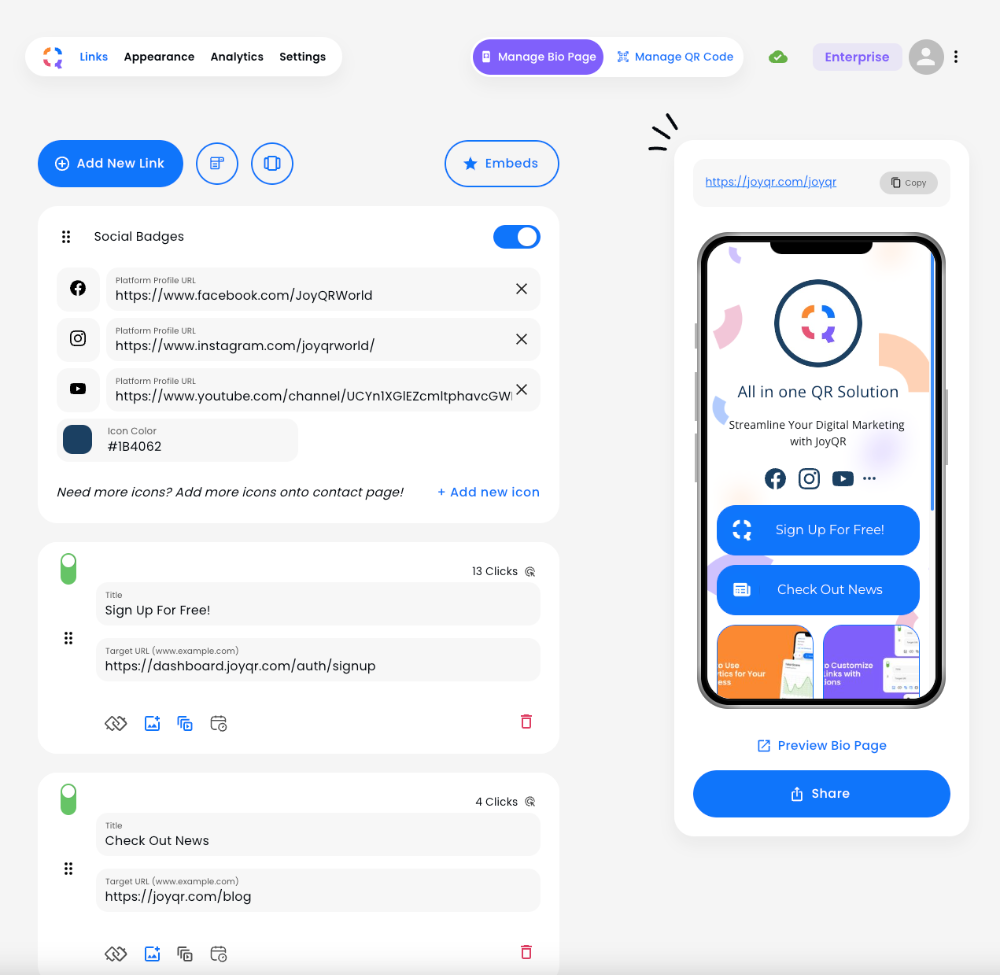 Demo JoyQR - JoyQR Link in Bio Page Options