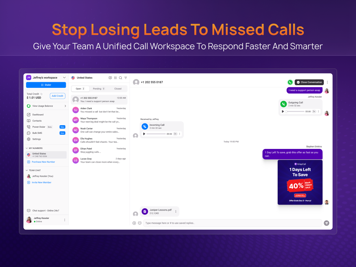 Diseñado para equipos modernos de GTM y soporte, KrispCall reduce el caos de herramientas y mejora la calidad de los datos. Ofrece alcance global con presencia local utilizando números en más de 100 países. El resultado son tasas de conexión más rápidas, tiempos de resolución más cortos e historiales de clientes más limpios que te ayudan a cerrar tratos más rápido y resolver problemas de manera más inteligente.