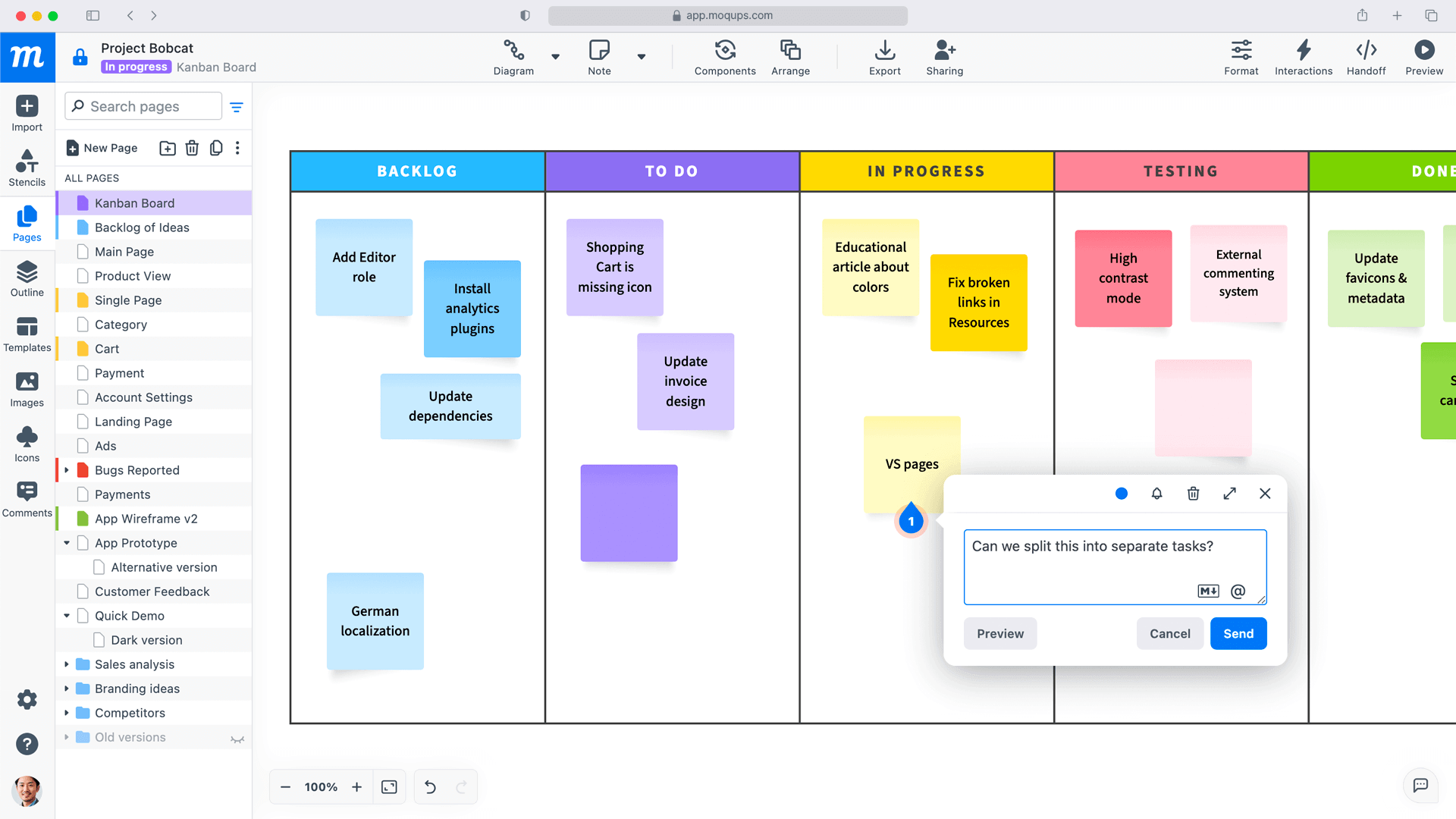 Colabora de forma síncrona o asíncrona: Con comentarios, anotaciones y edición en vivo, Moqups es la herramienta perfecta para discusiones y decisiones.