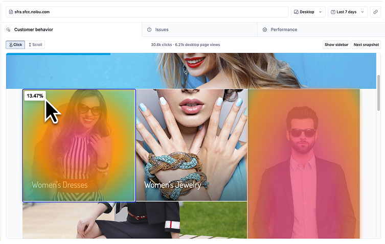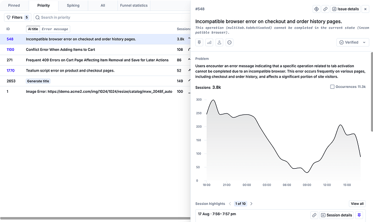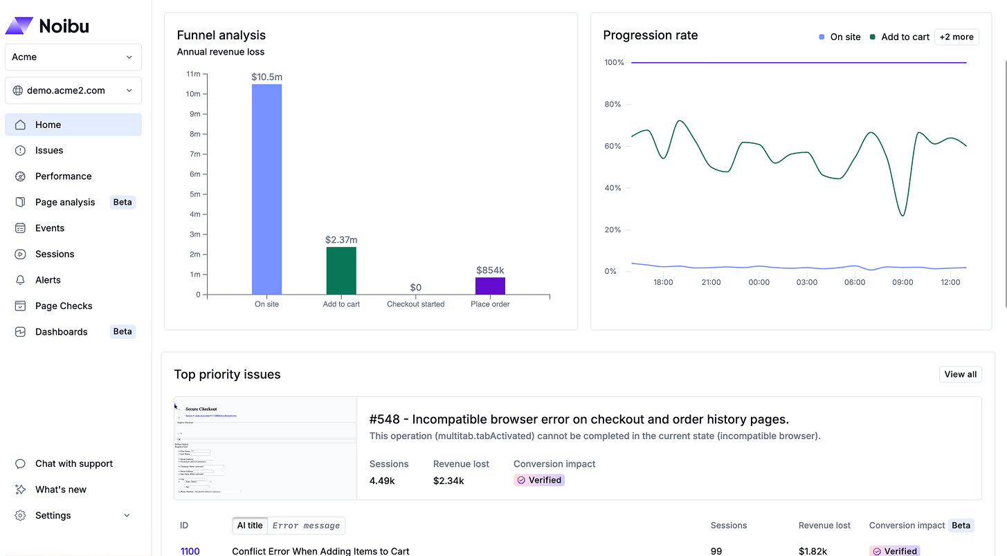 * La detección de problemas es enorme y siempre está mejorando. Los clientes tienen que estar realmente agitados para reportar problemas en un sitio web y muchos simplemente se frustrarán y se irán. La detección de problemas de Noibu está ahí para ayudar a llevar esos problemas a las personas que pueden solucionarlos, incluidas las sesiones que puedes ver para aprender las causas e impactos junto con una variedad de métricas para ayudarte a priorizar los más importantes.