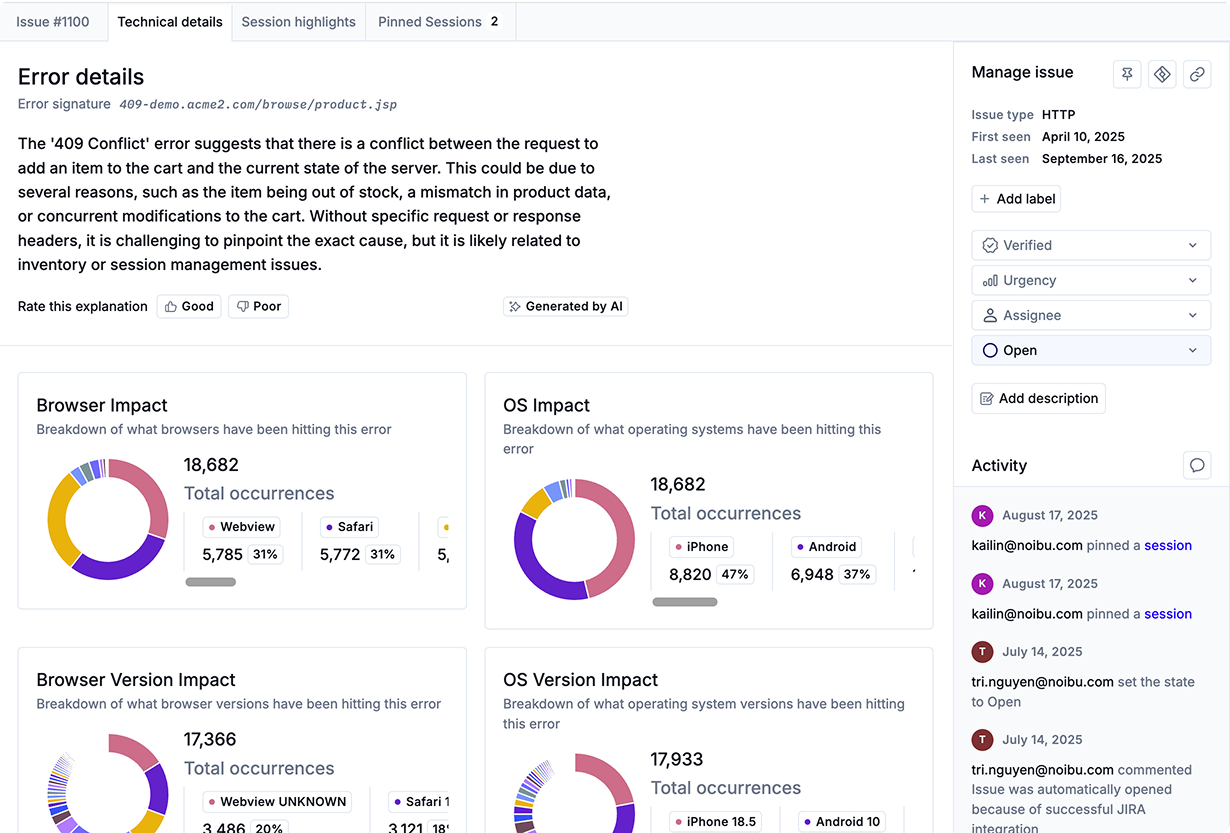 * El detalle de la sesión, incluidas las solicitudes/respuestas HTTP, es oro puro. También puedes hacer que siempre almacene elementos de solicitud, por ejemplo, un id de solicitud que puede ser utilizado en tu otro monitoreo. Combinar esto con la capacidad de buscar sesiones basadas en detalles específicos de tu plataforma lo hace perfecto en cualquier dirección: encontrar errores en Noibu y rastrearlos en tus otros sistemas de monitoreo/registros o encontrar errores externamente y rastrearlos en Noibu.