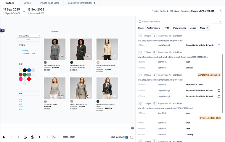 * La reproducción de sesiones increíblemente precisa hace que entender el flujo de problemas sea mucho más fácil de manejar. Como sabes, cualquier error que puedas recrear de manera confiable puedes solucionarlo; son los misteriosos los que pueden vivir por períodos prolongados de tiempo. Poder ver precisamente cómo el cliente interactuó con el sitio, incluido el error, es brillante.
