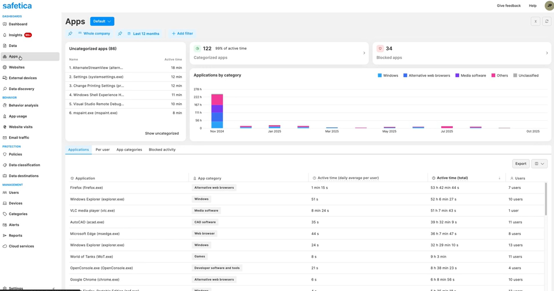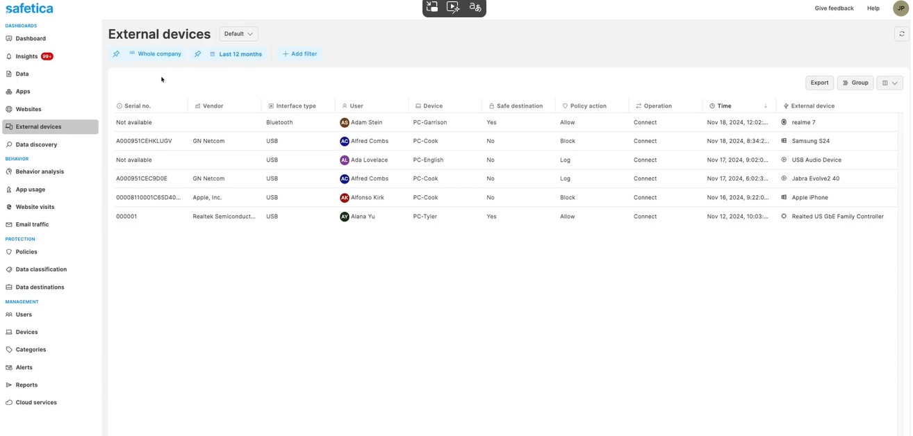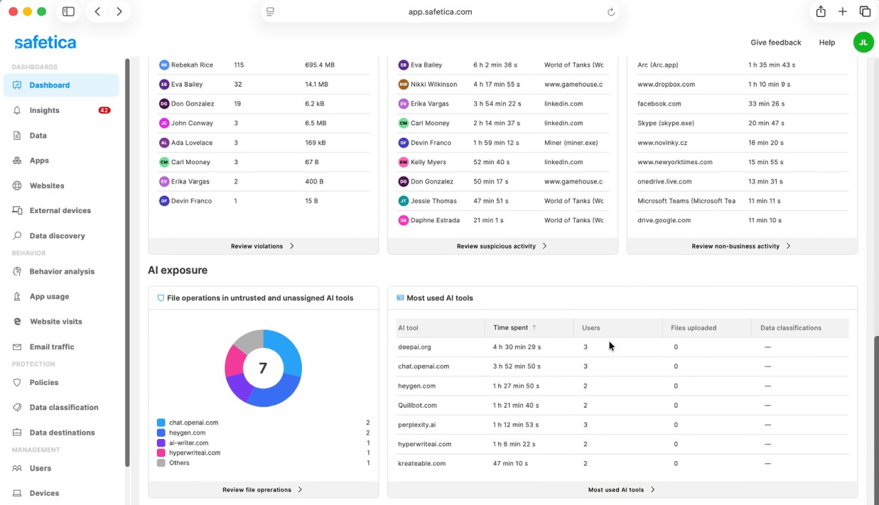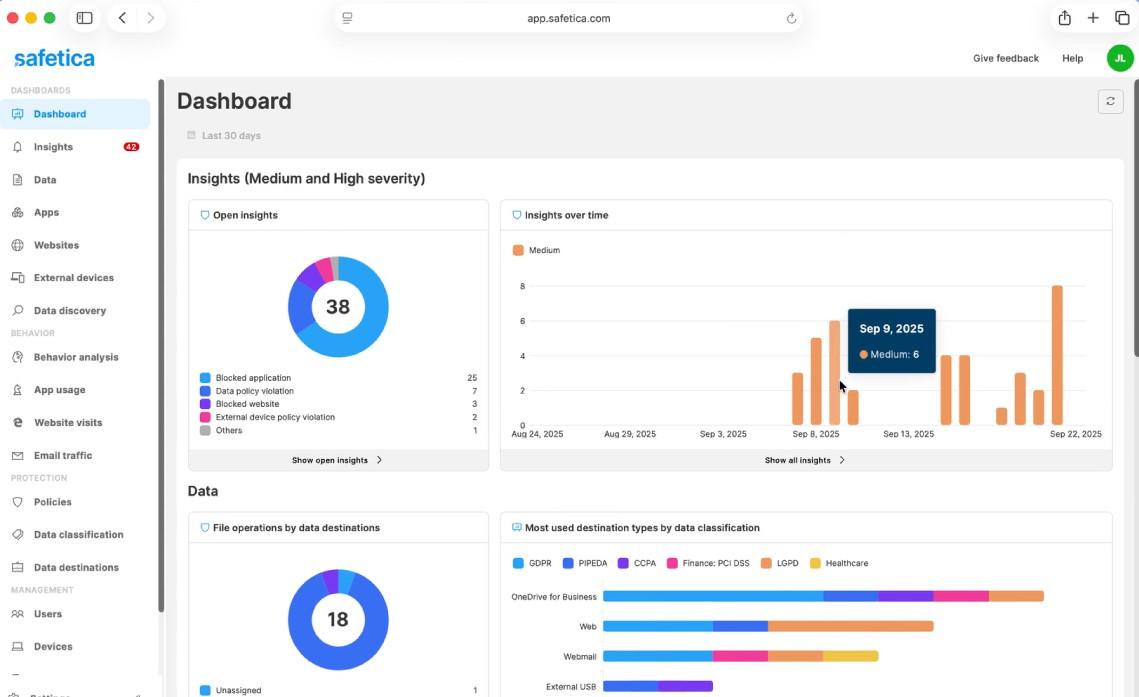 ✅ Informes y Administración: La consola centralizada de Safetica ofrece información clara y accionable —sirviendo como una única fuente de verdad para revisar amenazas, hacer cumplir políticas e investigar incidentes.