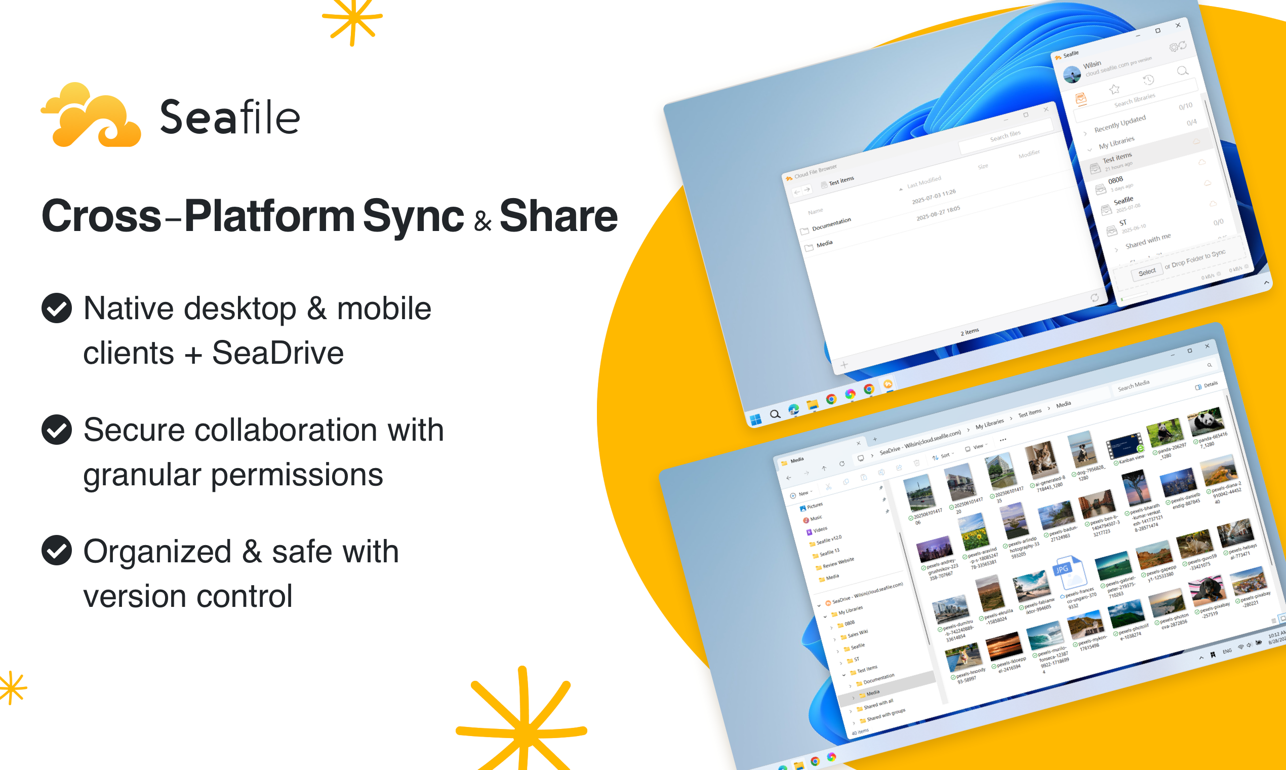 Sincronización y Compartición Multiplataforma: Seafile permite la sincronización y el acceso sin problemas de archivos a través de dispositivos Windows, Mac, Linux, iOS y Android mediante clientes nativos, apoyando la colaboración entre dispositivos.