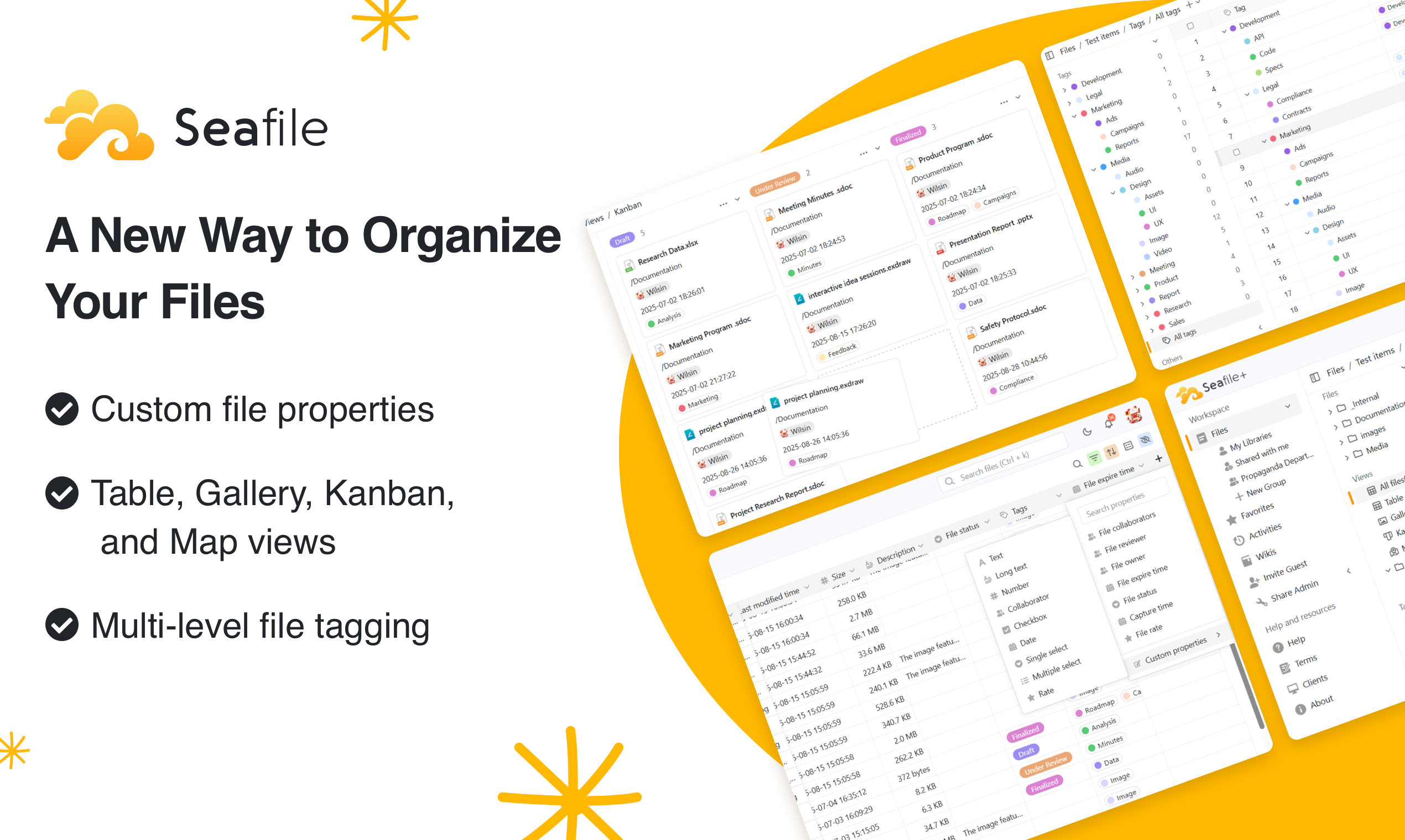 Organización Eficiente de Archivos: Los equipos pueden organizar archivos utilizando propiedades personalizadas, vistas flexibles (tabla, kanban, galería, mapa) y etiquetado multinivel, mejorando la eficiencia y accesibilidad en la gestión de archivos.