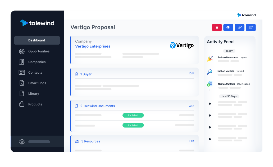Además, Talewind cuenta con Salas de Ventas Digitales integradas, también conocidas como Showrooms, que mejoran la experiencia de la propuesta. Estos centros interactivos para compradores permiten a los equipos de ventas compartir todo el contenido relacionado con el acuerdo en un solo lugar, permitiendo el seguimiento del compromiso en tiempo real, la identificación de los principales interesados y la aceleración de la velocidad del acuerdo. Además, las integraciones sin problemas con sistemas populares de Gestión de Relaciones con Clientes (CRM) como Salesforce y HubSpot aseguran que cada propuesta esté directamente vinculada al proceso de ventas, mejorando la eficiencia y efectividad general.