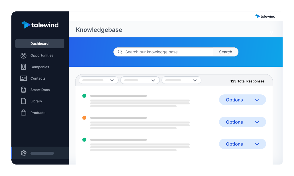 Un diferenciador clave de Talewind es su modelo de servicio totalmente gestionado. A diferencia de las soluciones de software tradicionales que requieren que los usuarios manejen todos los aspectos de la creación y gestión de propuestas, Talewind se encarga del trabajo pesado. Desde la incorporación y configuración de contenido hasta la optimización continua, los expertos de Talewind colaboran con los equipos para establecer un proceso de propuestas escalable y repetible. Este enfoque práctico reduce significativamente los tiempos de entrega de propuestas, con clientes que a menudo experimentan hasta un 80% de disminución, al tiempo que minimiza los errores manuales en la documentación.