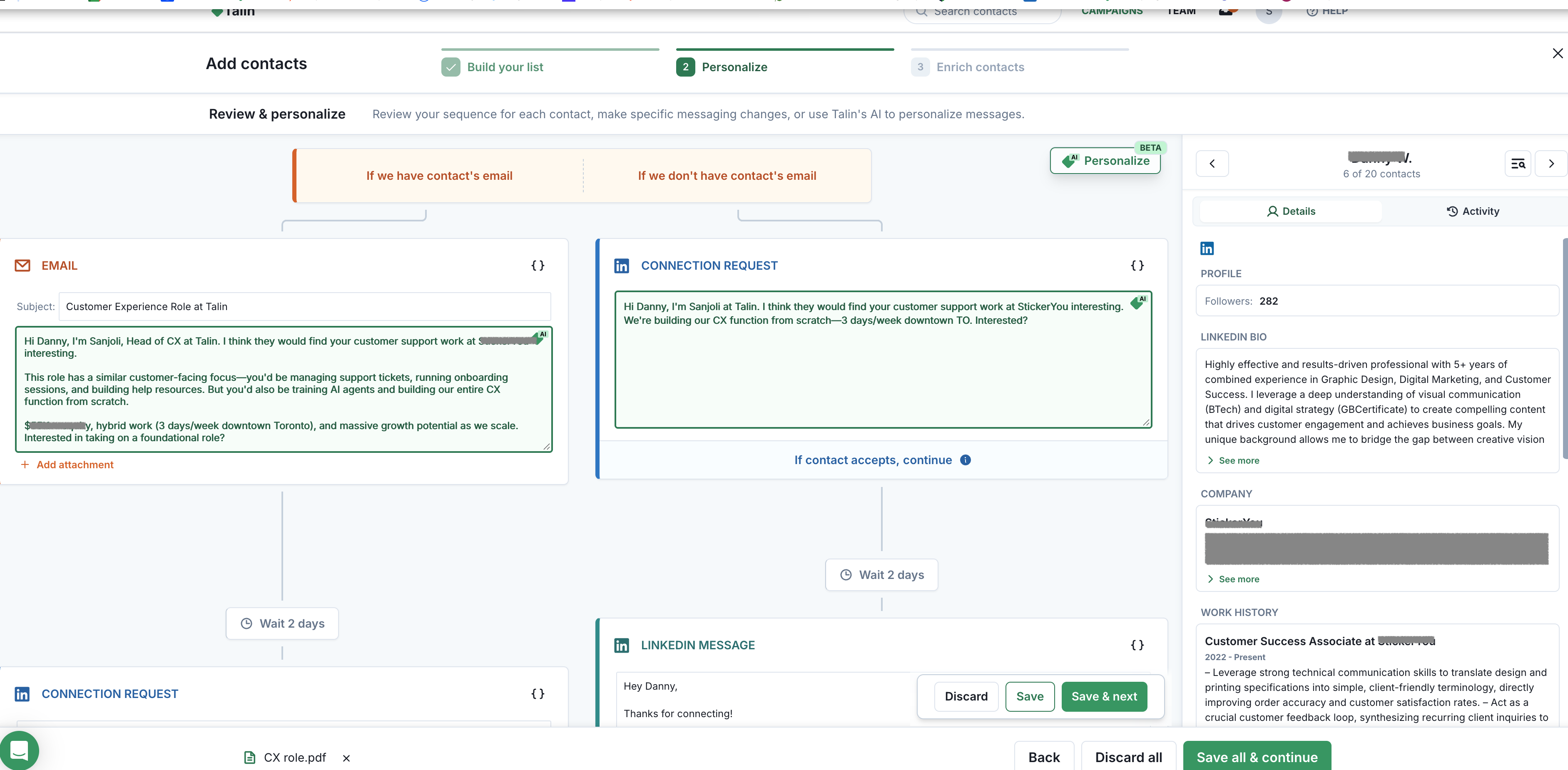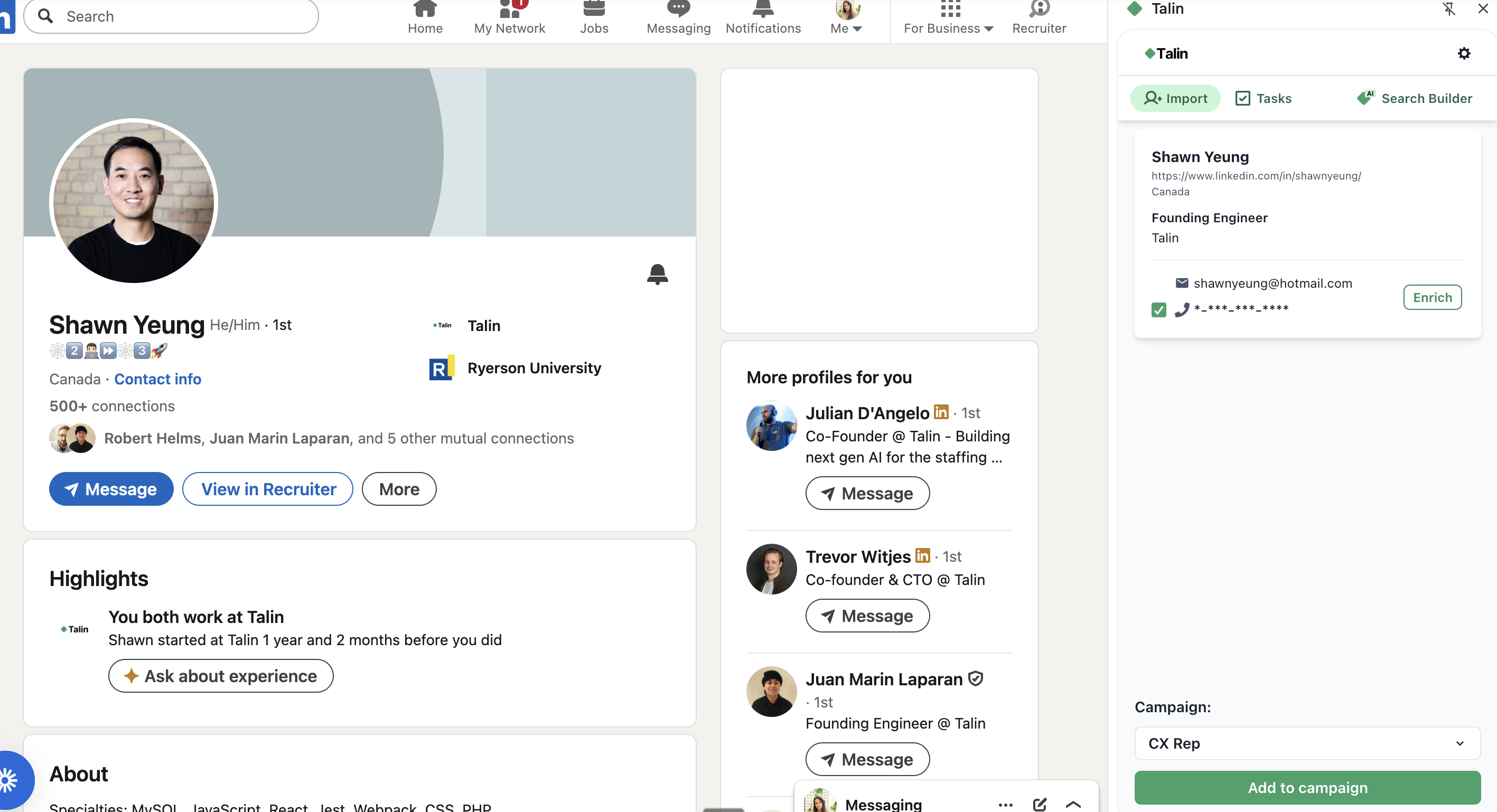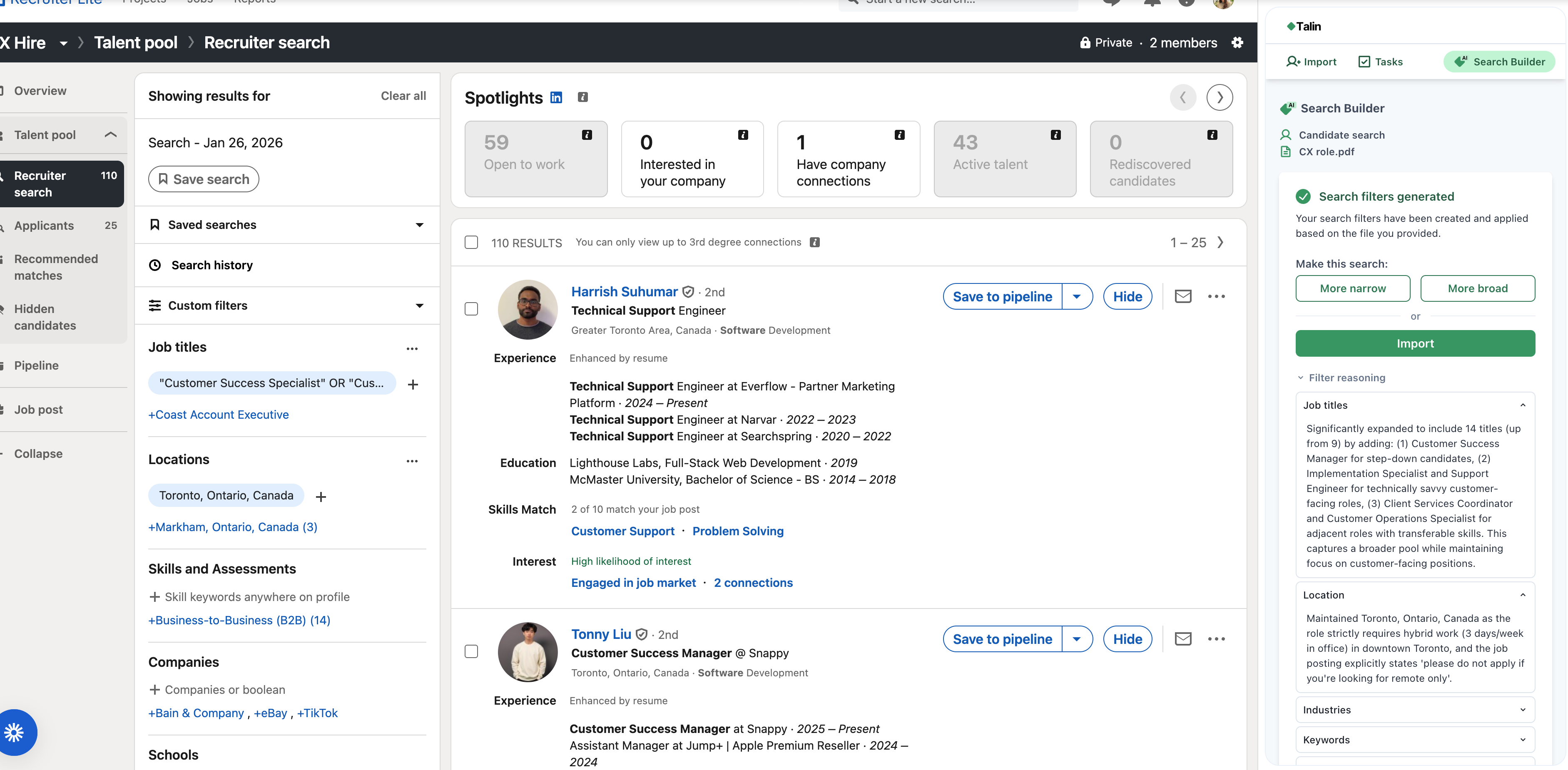Me gusta que Talin sea una plataforma que maneja mensajes a través de diferentes canales. También me gusta la función automatizada y la herramienta de IA, que preselecciona candidatos según su adecuación al puesto. Esa es realmente una característica muy poderosa. Además, normalmente, preseleccionar candidatos es una tarea complicada y lleva mucho tiempo. Con esa herramienta, está completamente automatizado. Resume el perfil de LinkedIn para que no tenga que revisarlo y lo compara automáticamente con la descripción del puesto o la descripción del trabajo, lo cual es muy útil. La configuración inicial fue bastante fácil ya que tuvimos un oficial de servicio al cliente increíble que nos guió a través de una demostración y nos explicó todo, por lo que funcionó extremadamente bien. Reseña recopilada por y alojada en G2.com.