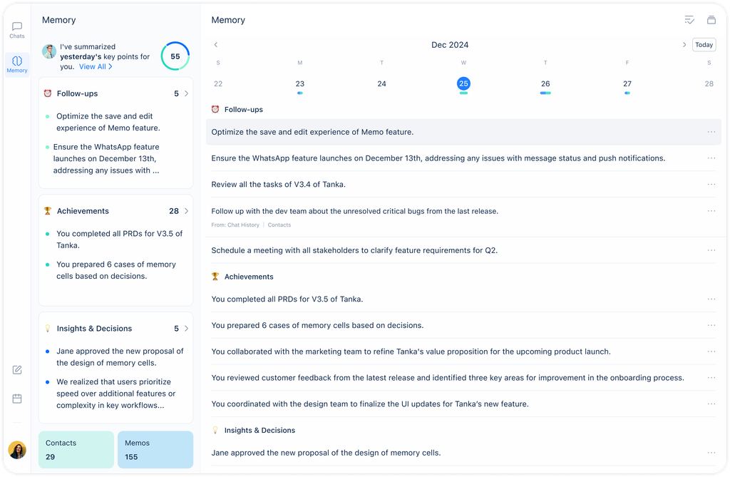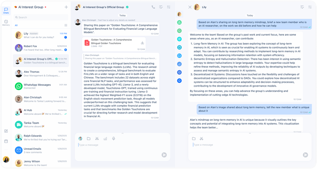 Soy un probador beta temprano de Tanka y he utilizado muchas herramientas de productividad emergentes que van desde Superhuman hasta Cron y Linear. Estaba lanzando mi primera startup y buscaba un mensajero de equipo nativo de IA que pudiera aliviar parte de mi carga mental de recordar detalles del trabajo. Y tengo muchas comunicaciones externas, por lo que mis mensajes de trabajo están por todas partes, desde WhatsApp hasta Telegram y Slack. Así que necesitaba un lugar donde se pudieran agregar todos los mensajes fácilmente, y al mismo tiempo aprovechar la IA para organizar y resaltar mi conocimiento diario de manera proactiva, sin el cambio de contexto de copiar y pegar frecuentemente indicaciones y respuestas entre aplicaciones de mensajería y asistentes de IA. También buscaba reducir mi tiempo perdido en responder preguntas repetitivas, si la herramienta de mensajería puede RAG mi base de conocimiento de la empresa y responderlas (semi) automáticamente. Tanka satisface la mayoría de mis requisitos anteriores y nuestro pequeño equipo ha sido feliz usuario gratuito de Tanka durante unos meses, usándolo a diario. Su servicio de atención al cliente es accesible y ofrece demostraciones muy amigables para el usuario. El plan piloto gratuito es generoso y facilita una incorporación rápida e instantánea. Reseña recopilada por y alojada en G2.com.