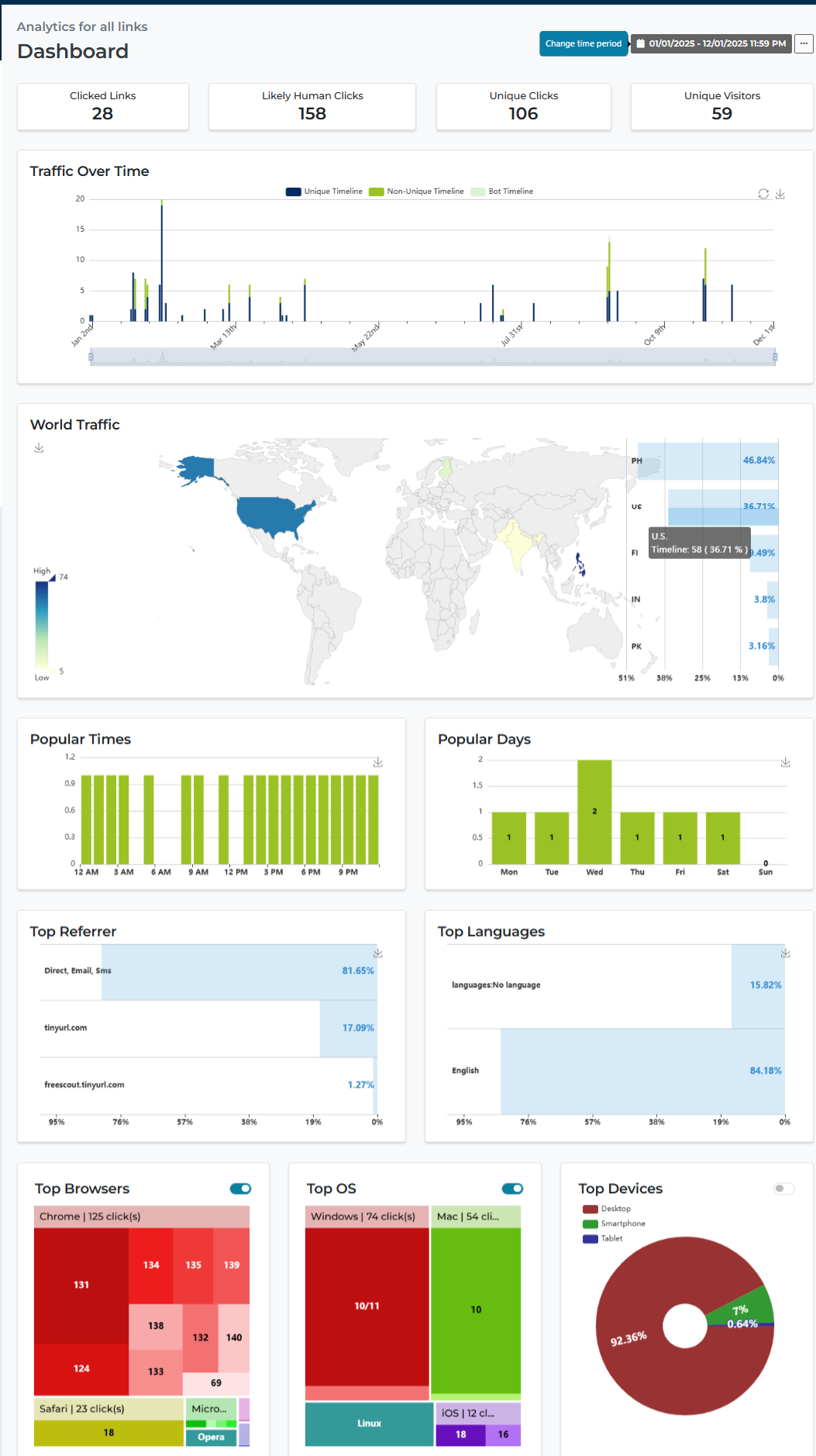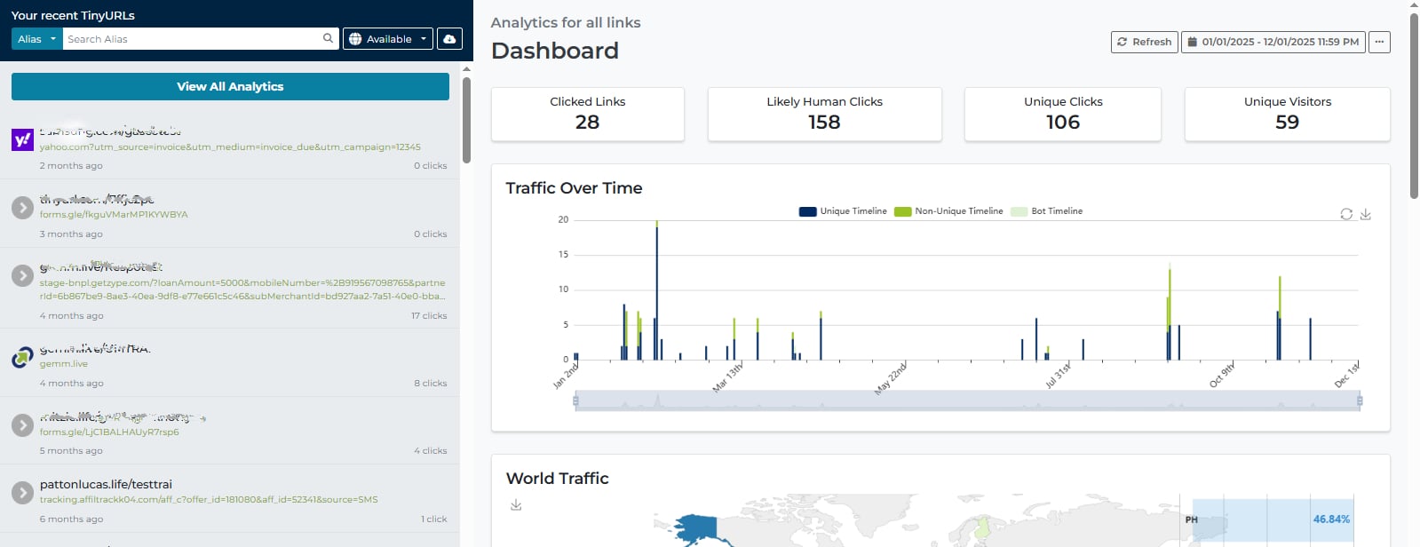 TinyURL también funciona como una plataforma de gestión de enlaces, ofreciendo herramientas que ayudan a los usuarios a organizar, controlar y analizar sus enlaces. Los usuarios pueden crear alias personalizados, agrupar enlaces con etiquetas, actualizar URLs de destino, establecer reglas de expiración y generar códigos QR vinculados a sus enlaces cortos. Para el seguimiento y la medición, TinyURL proporciona analíticas de enlaces, incluyendo conteo de clics, referentes, datos geográficos, dispositivos y tendencias de tráfico a lo largo del tiempo.