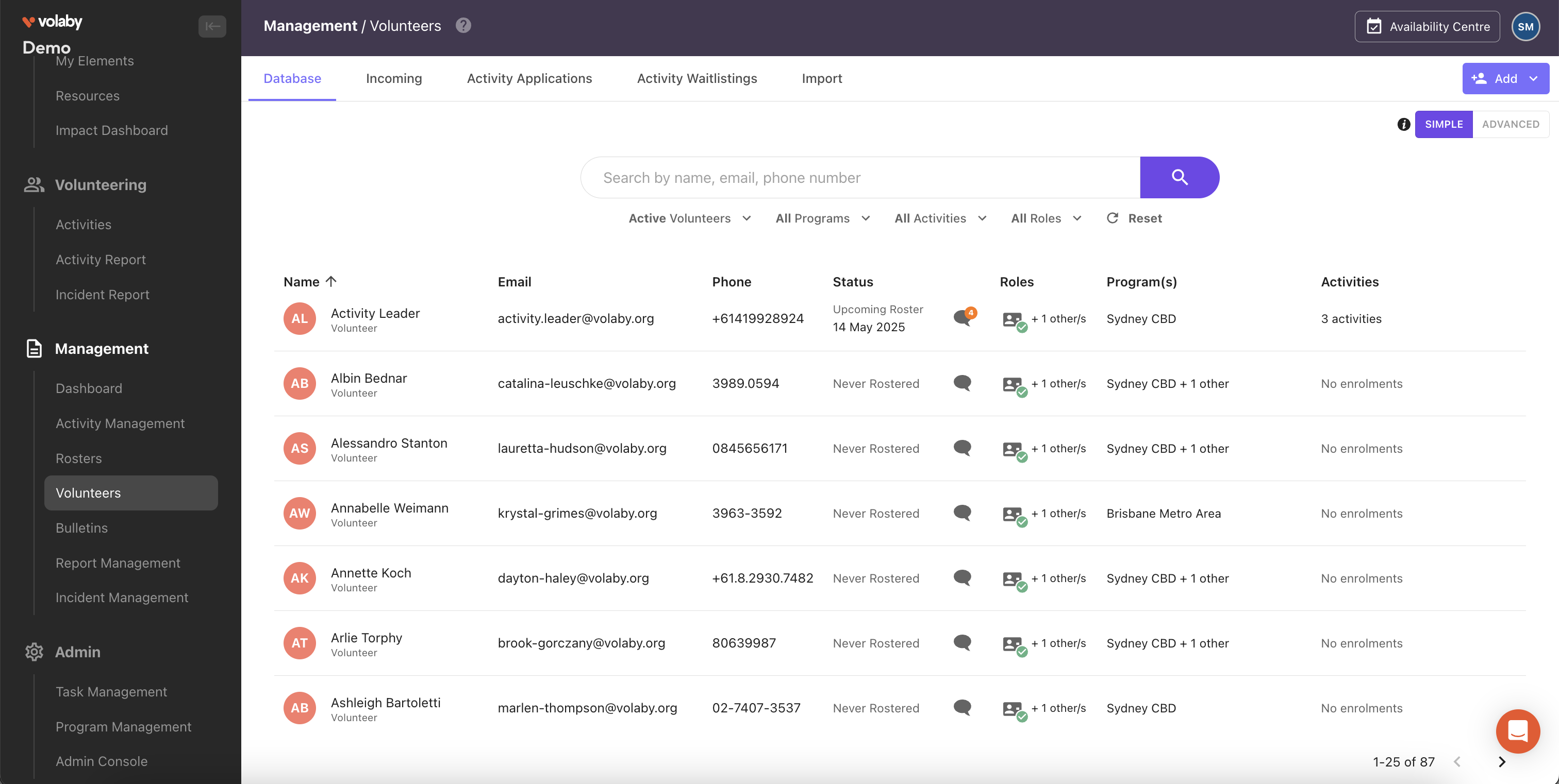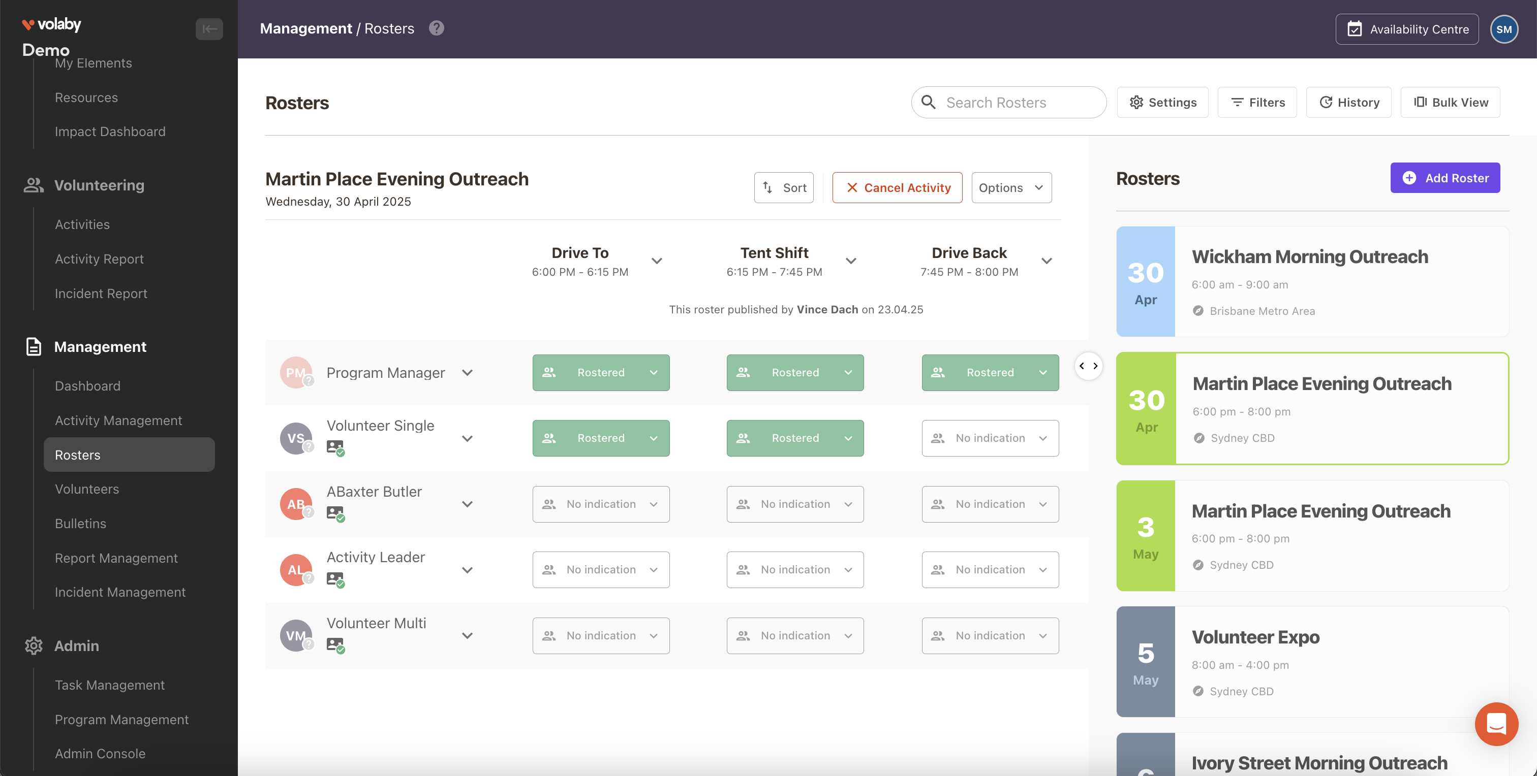 Volaby ha hecho que gestionar a nuestros voluntarios y programas sea mucho más fácil. Nuestros voluntarios ahora pueden solicitar roles, elegir sus horarios y turnos, y enviar su disponibilidad todo en un solo lugar. Anteriormente gestionábamos con múltiples sistemas, pero nos encanta que podamos hacerlo todo en un solo sitio. También fue muy fácil comenzar con el sistema, importar a nuestros propios voluntarios fue sencillo y los horarios requieren poco trabajo manual, los voluntarios solo establecen su disponibilidad o se autoasignan y luego gestionamos según sea necesario.