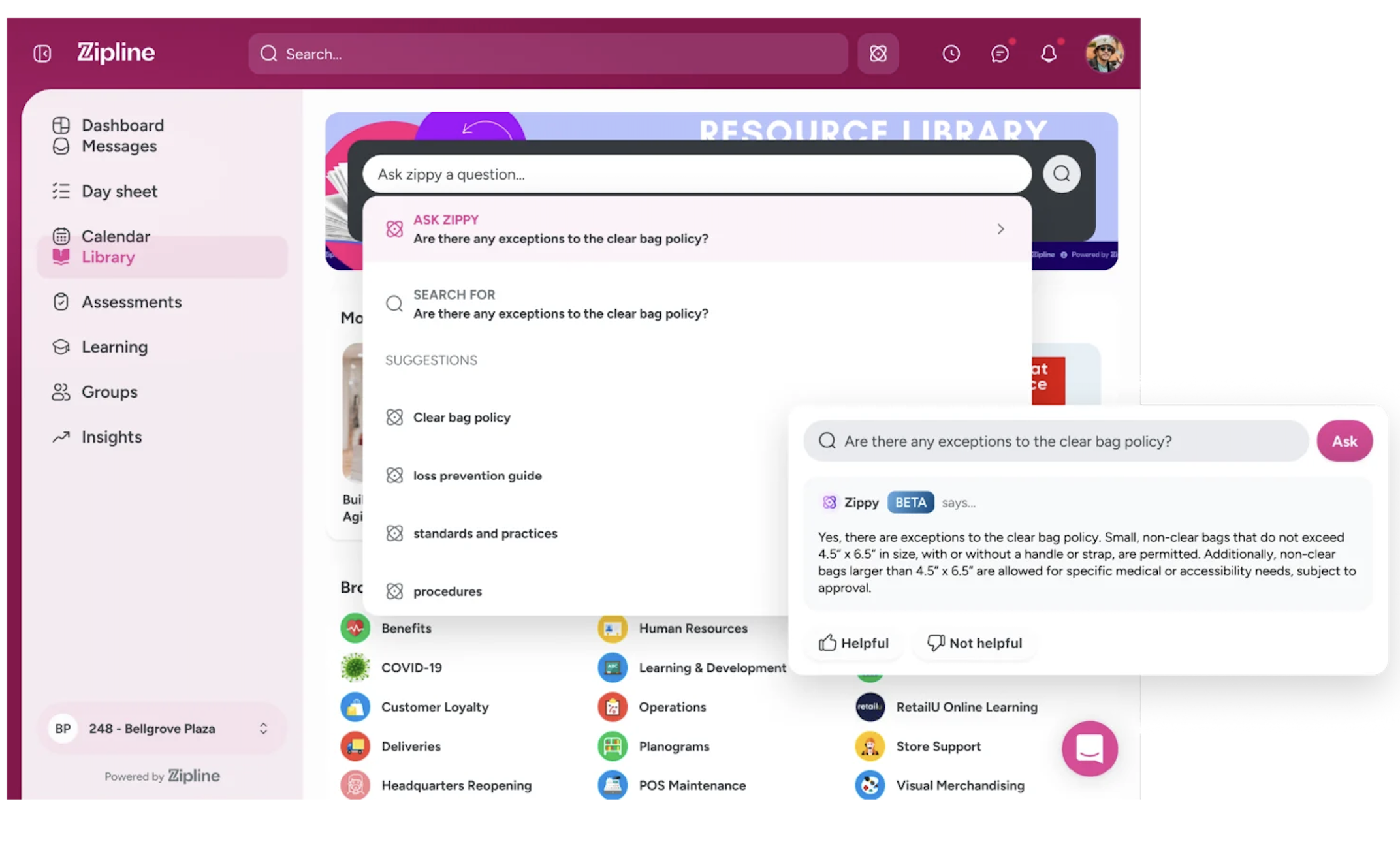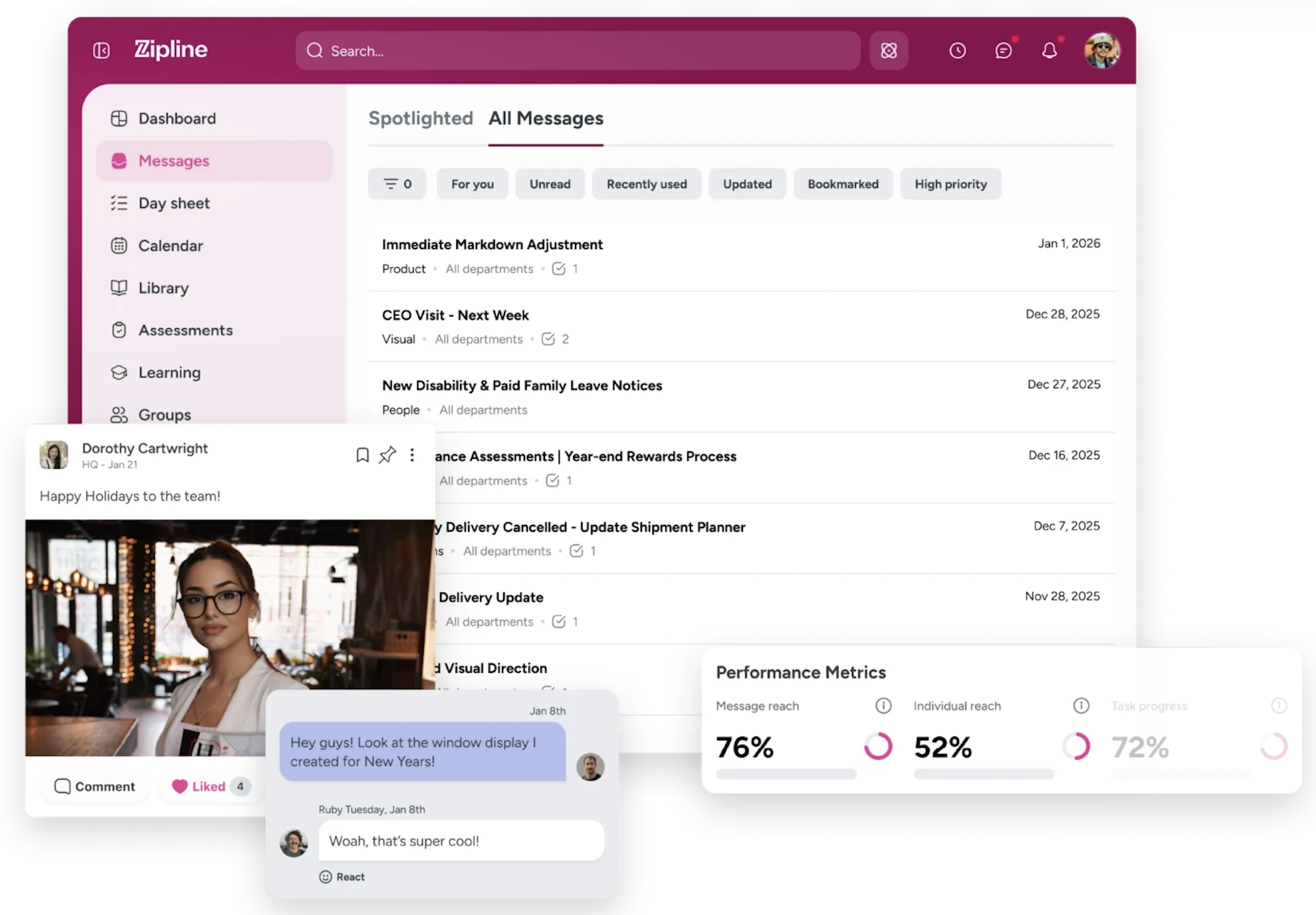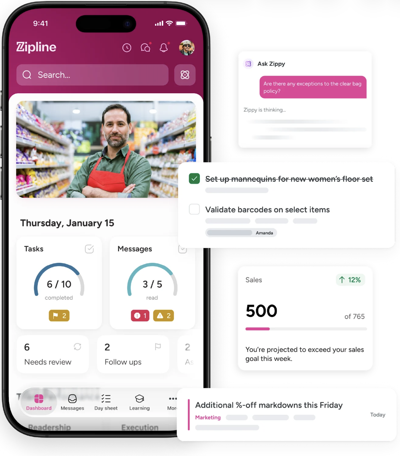 Zipline ha unido a nuestra empresa de maneras que nunca habíamos experimentado antes. Ha fomentado un verdadero sentido de comunidad entre nuestros equipos a nivel nacional. Tiendas que antes tenían poca o ninguna interacción ahora se conectan entre sí diariamente a través de la plataforma.