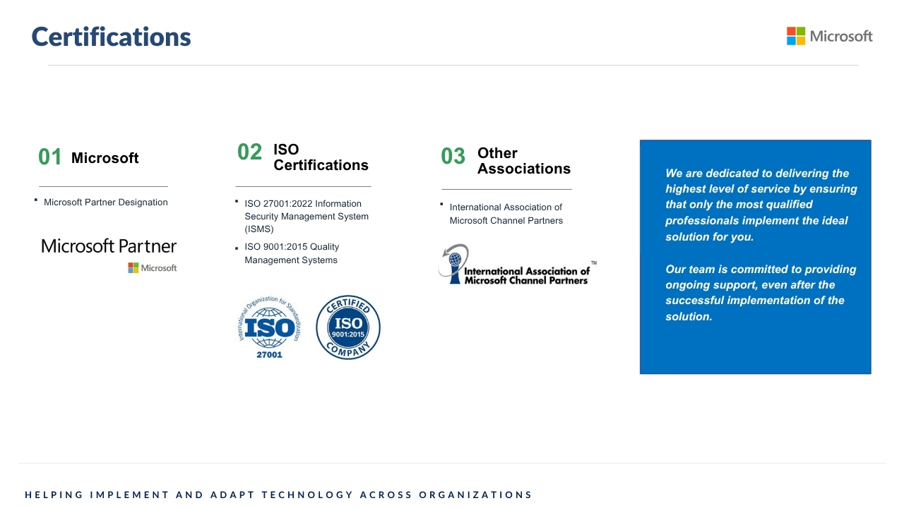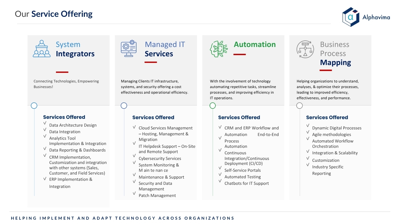 Nous nous spécialisons dans la mise en œuvre de bout en bout de solutions CRM, ERP et Cloud de premier plan permettant à nos organisations clientes d'adopter et de réaliser la véritable valeur de leurs investissements technologiques.
