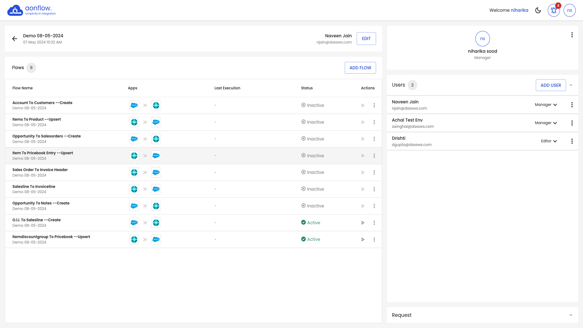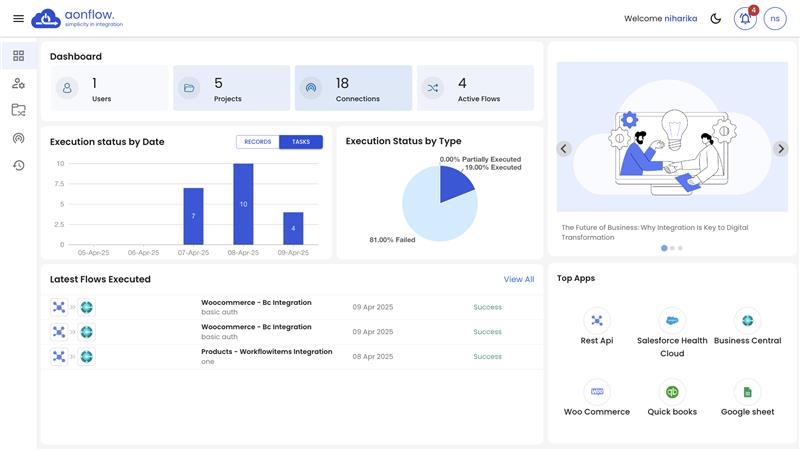 Aonflow est une plateforme d'intégration puissante mais facile à utiliser (iPaaS) qui connecte vos applications cloud et automatise les flux de travail, sans besoin d'expertise technique. Que vous soyez une entreprise en croissance ou une grande entreprise, Aonflow vous aide à briser les silos en unifiant vos systèmes ERP, CRM, comptabilité, eCommerce et marketing.\nAvec des connecteurs préconstruits pour des plateformes comme Salesforce, Microsoft Dynamics 365, Business Central, QuickBooks, HubSpot et WooCommerce, vous pouvez déplacer les données entre les systèmes de manière transparente et en quasi temps réel. Notre interface intuitive permet à vos équipes de concevoir des intégrations en quelques minutes, de surveiller les flux de travail avec facilité et de personnaliser l'automatisation pour répondre aux besoins uniques de votre entreprise.\nFini les systèmes bricolés ou les opportunités perdues—Aonflow garantit que vos équipes passent moins de temps sur des tâches manuelles et plus de temps à stimuler la croissance.