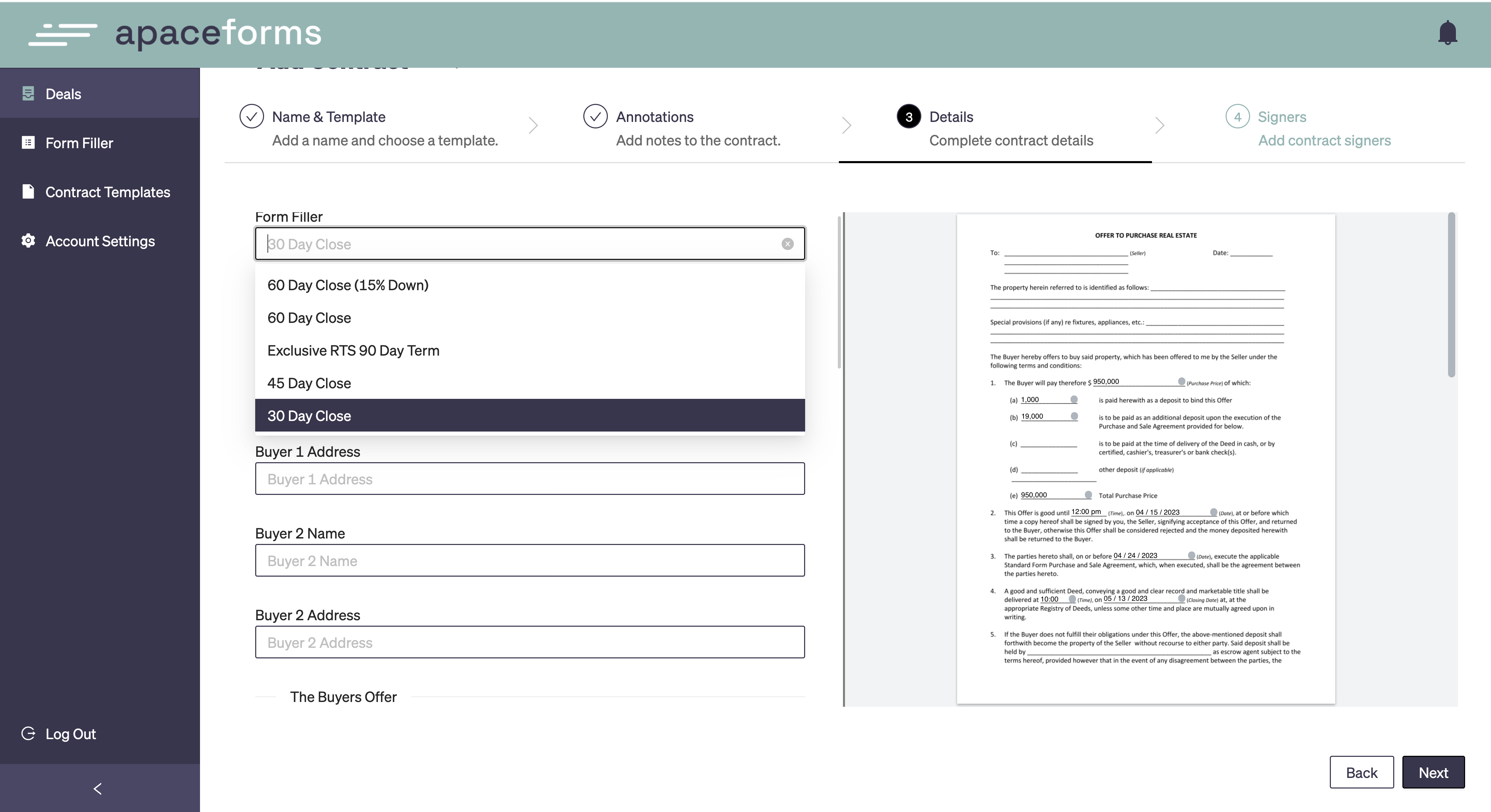 Our innovative form fillers allow users to preset deal criteria, which Apace uses as a guide to calculate and auto-fill data within future contracts.