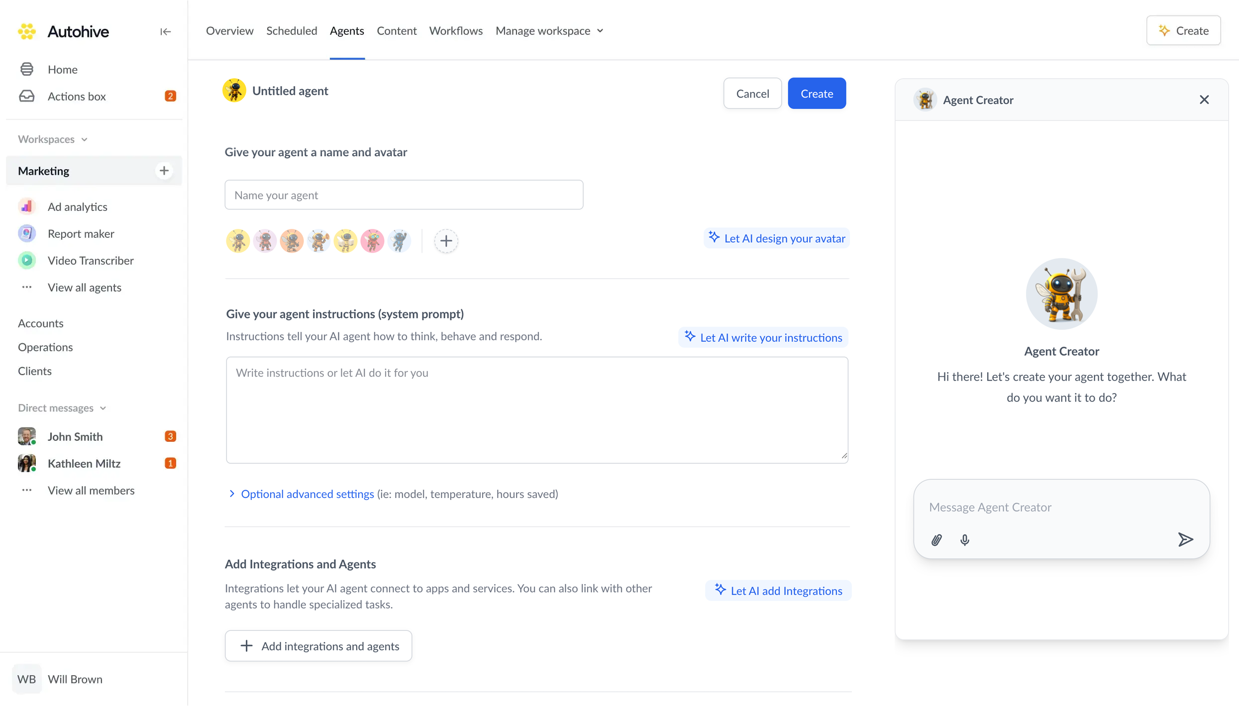 Constructeur d'agents sans code : Créez et personnalisez vos propres agents IA pour s'adapter à vos processus spécifiques et aux directives de votre marque sans écrire de code.