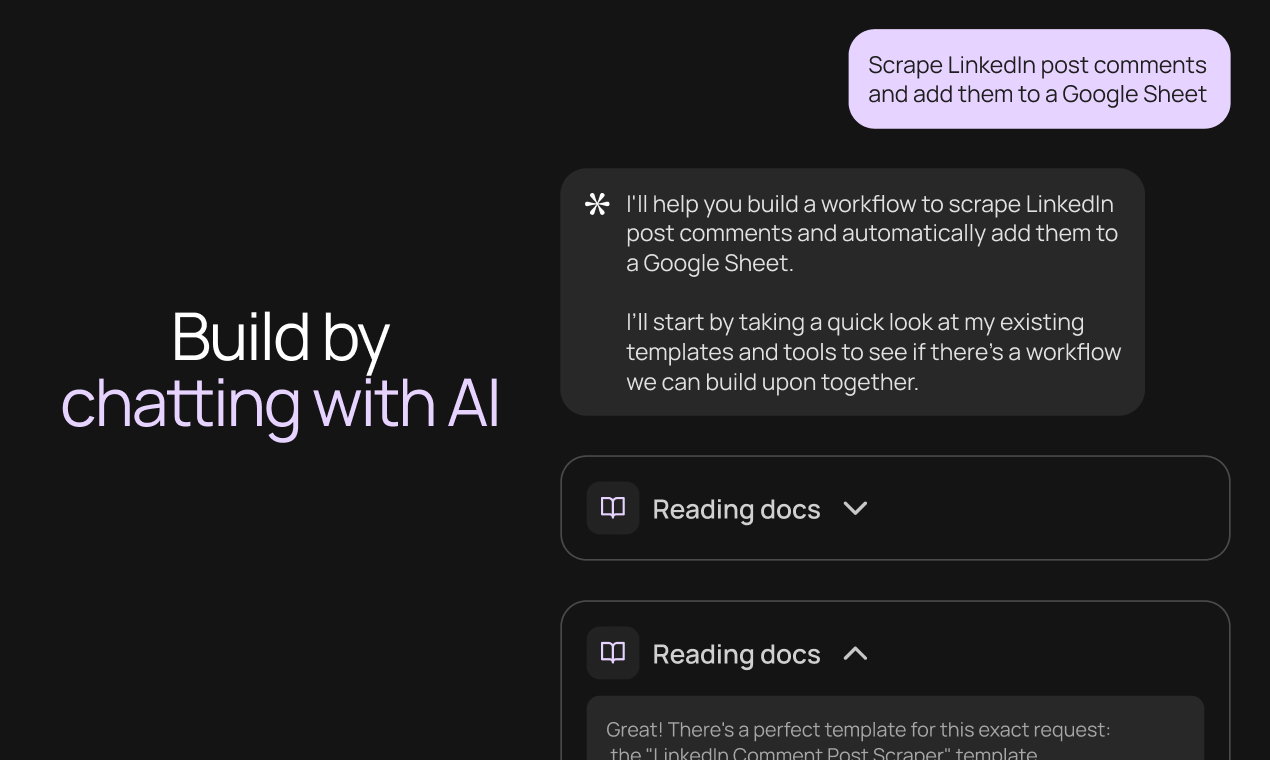 Automatisation en langage naturel : Construisez et déployez des flux de travail en décrivant le résultat souhaité — aucune programmation requise.
