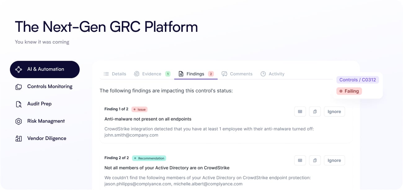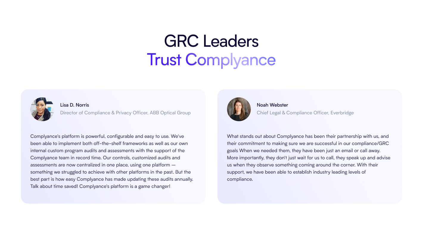 Complyance est la plateforme GRC d'entreprise axée sur l'innovation et l'IA, approuvée par les entreprises du Fortune 500. Conçue pour les environnements complexes des entreprises et des gouvernements, Complyance utilise l'automatisation sécurisée et testée sur le terrain ainsi que l'IA pour réduire le travail manuel de GRC de 70 % et permettre une gestion des risques continue et basée sur les données.