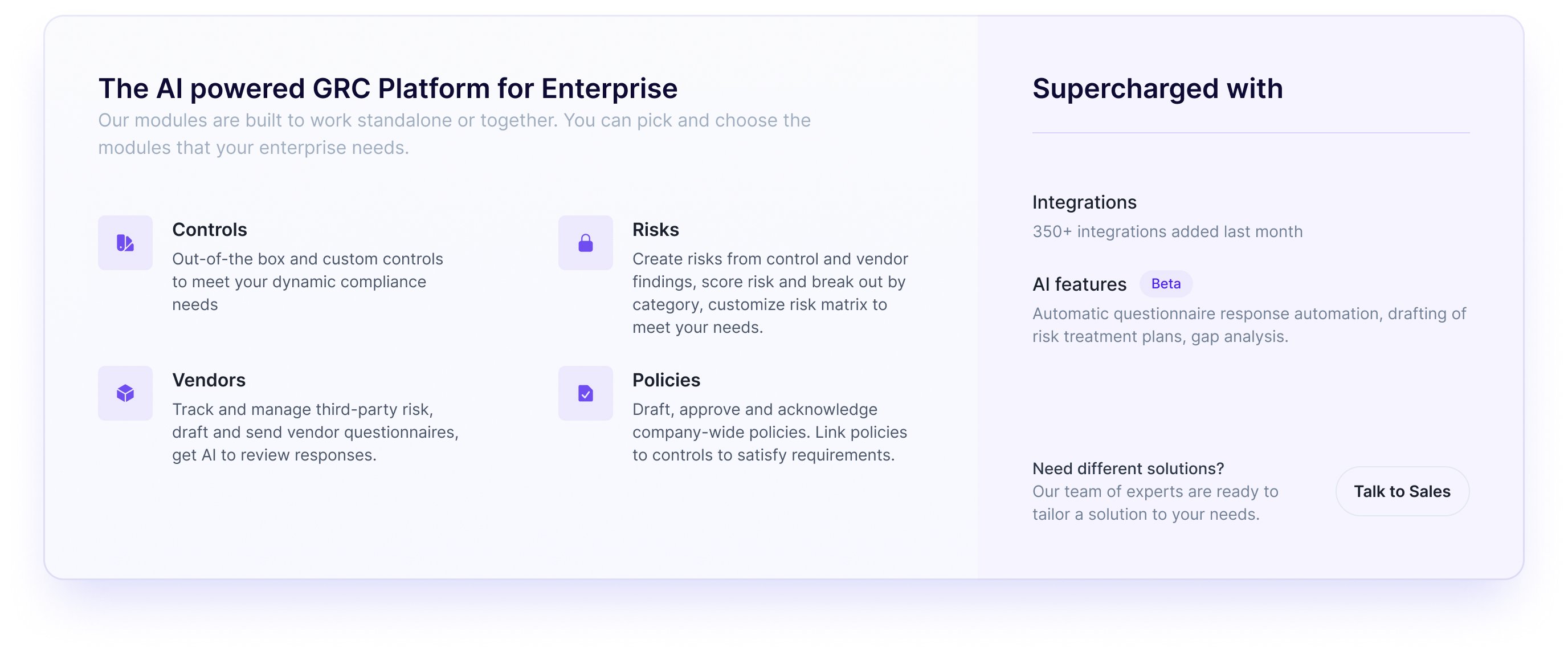 Nous combinons cinq modules puissants, Contrôles, Risques, Fournisseurs, Politiques et Confiance, en une seule plateforme intégrée qui simplifie les opérations de conformité et libère des perspectives stratégiques. Que vous naviguiez dans SOC 2, ISO 27001, HIPAA ou un cadre personnalisé, vous restez maître de la situation.