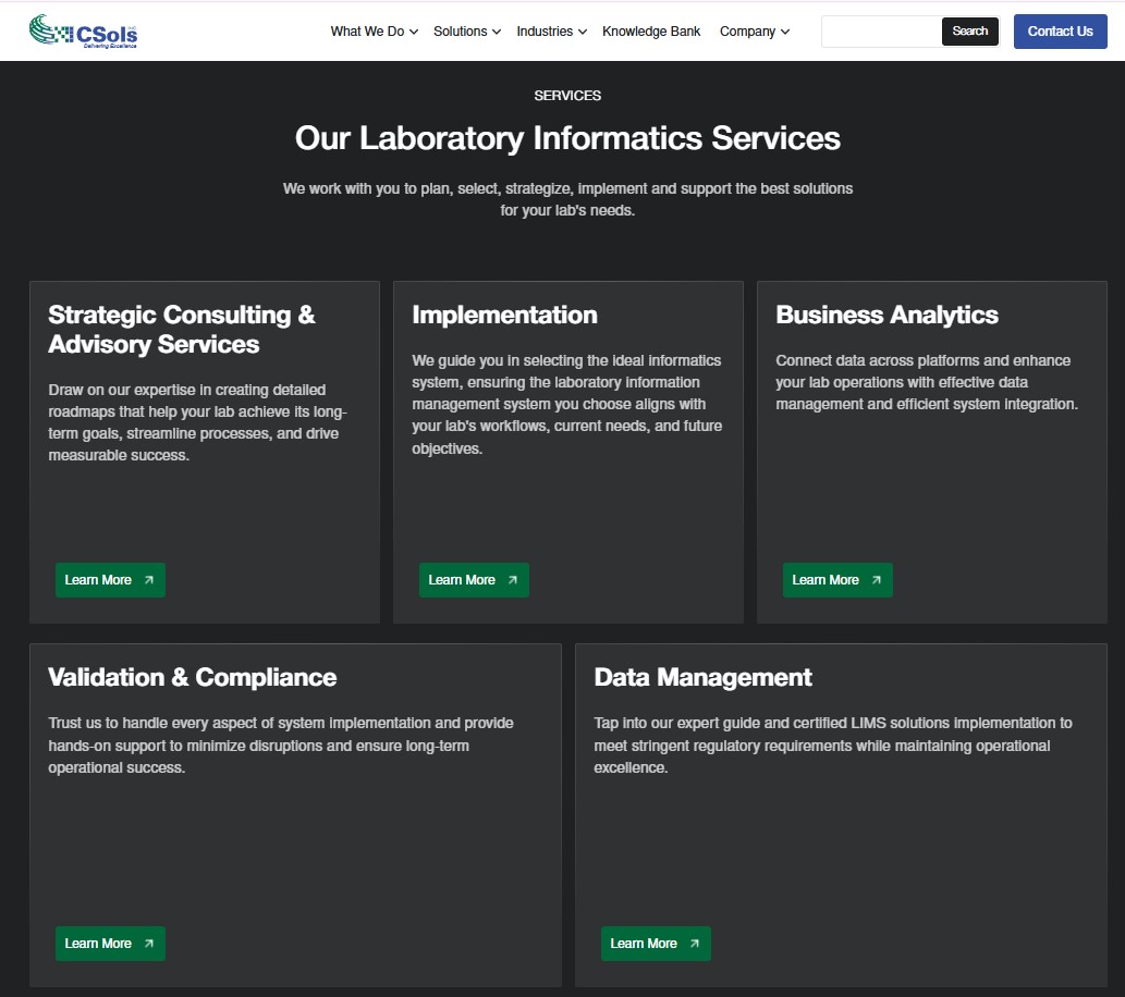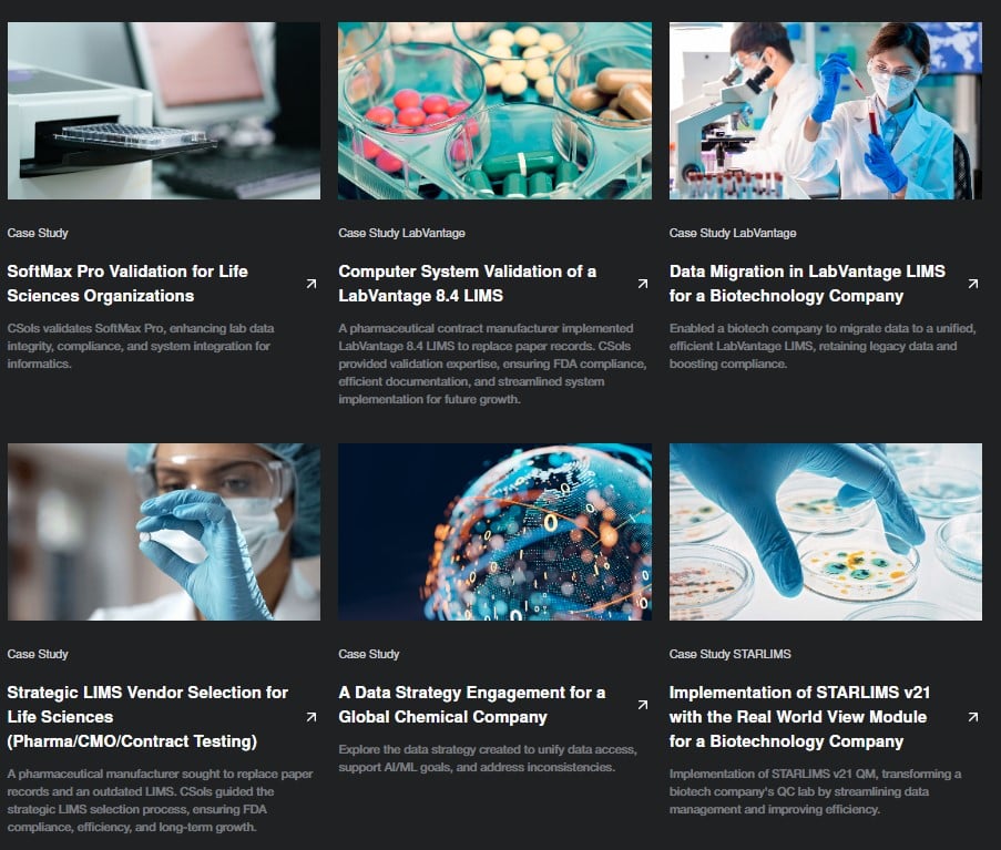 Le principal cabinet de conseil en informatique de laboratoire en Amérique du Nord (LIMS, ELN, CDS, SDMS). Grâce à notre équipe d'experts en informatique, domaine, réglementation et IT, nous fournissons des services de conseil en informatique aux industries des sciences de la vie, chimique, alimentaire et des boissons, énergétique, minière et environnementale depuis plus de deux décennies. En tant que cabinet véritablement indépendant, nous offrons des conseils objectifs et adaptons des solutions à travers nos services de planification stratégique, mise en œuvre et validation. Pour plus d'informations sur CSols, visitez www.csolsinc.com.