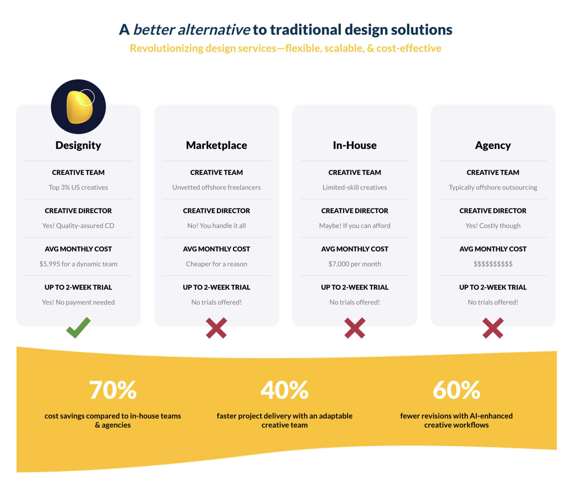 Designity, une agence de design virtuelle, offre des services créatifs à la demande aux entreprises, une approche connue sous le nom de CaaS (Creative-as-a-Service). Ce modèle donne accès à une équipe composée des 3% des meilleurs créatifs et marketeurs basés aux États-Unis, dirigée par un directeur créatif désigné, qui est à son tour soutenu par des stratèges marketing et des chefs de projet - servant de partenaire stratégique.
