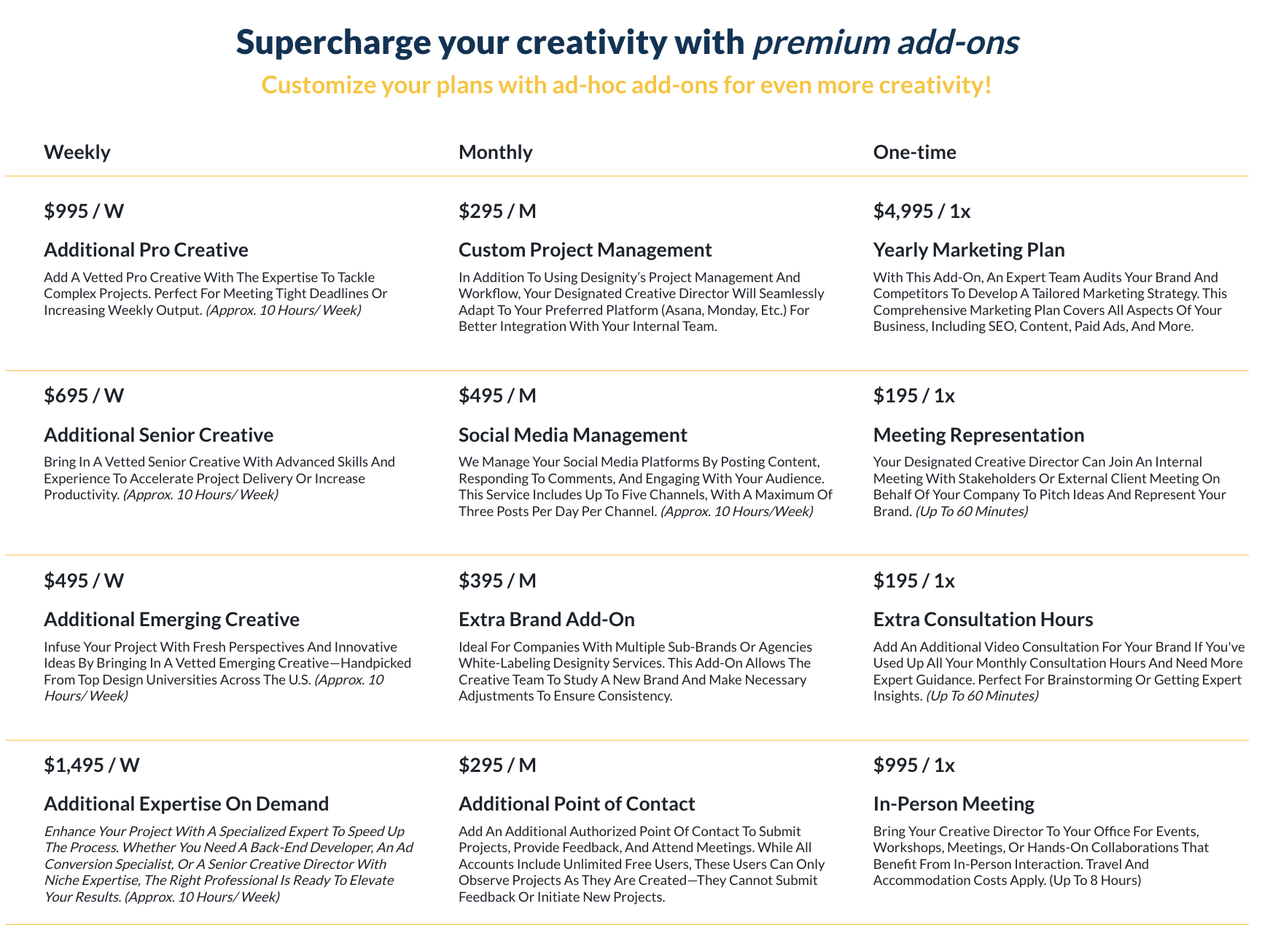 Que vous soyez sur notre plan Plus, Premium ou Custom, vous avez accès à plus de 100 services créatifs et marketing - du branding et de la création publicitaire à l'UI/UX, au SEO et à la vidéo - tout sous un même toit. Vous bénéficiez également d'un assistant IA formé à votre marque qui aide à améliorer l'efficacité du flux de travail et à accélérer les projets.