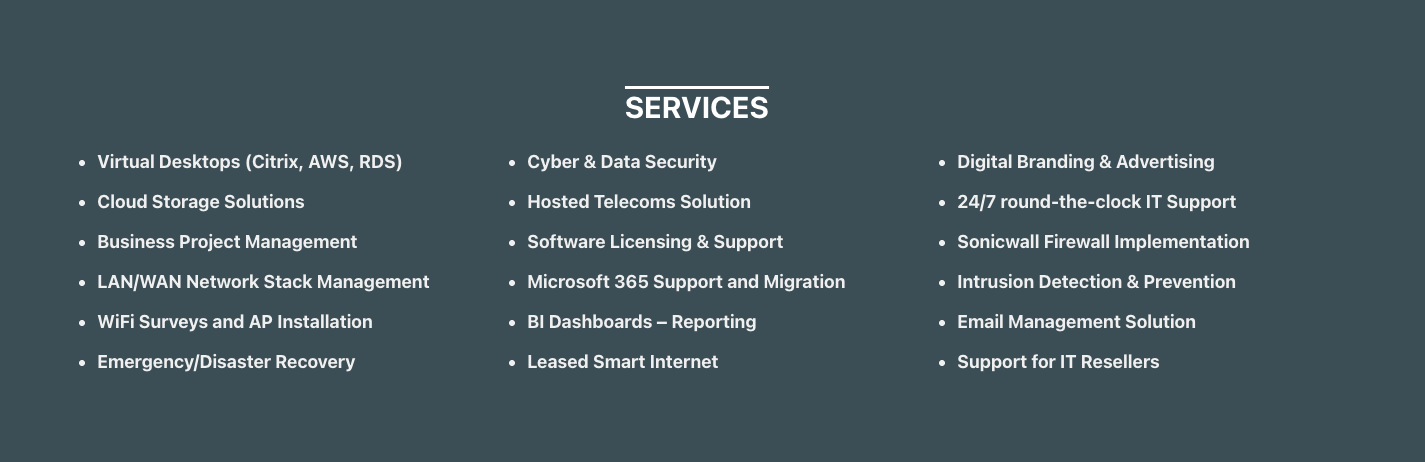 L'organisation 7 Layer est composée de trois principaux secteurs verticaux qui incluent : 1) Services Gérés – support informatique continu et gestion de l'ensemble de l'environnement, augmentation du personnel d'infrastructure d'entreprise 2) Cybersécurité – services MSSP, CISO fractionné, évaluations de sécurité et tests de pénétration, remédiation des risques. 3) Services de Conseil – évaluation de l'infrastructure, stratégie informatique et feuille de route, rationalisation des coûts, livraison de projets informatiques, CIO fractionné.
