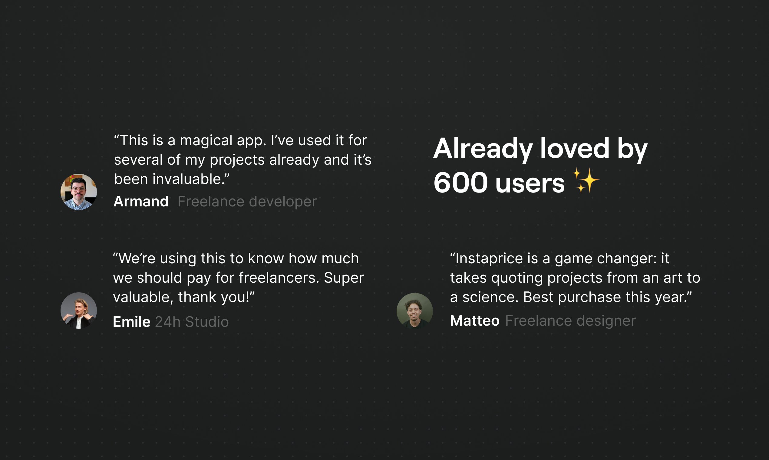 Instaprice est vraiment utile lorsque j'ai besoin de fournir rapidement un devis pour mes services. L'interface est propre et très bien conçue. Avis collecté par et hébergé sur G2.com.