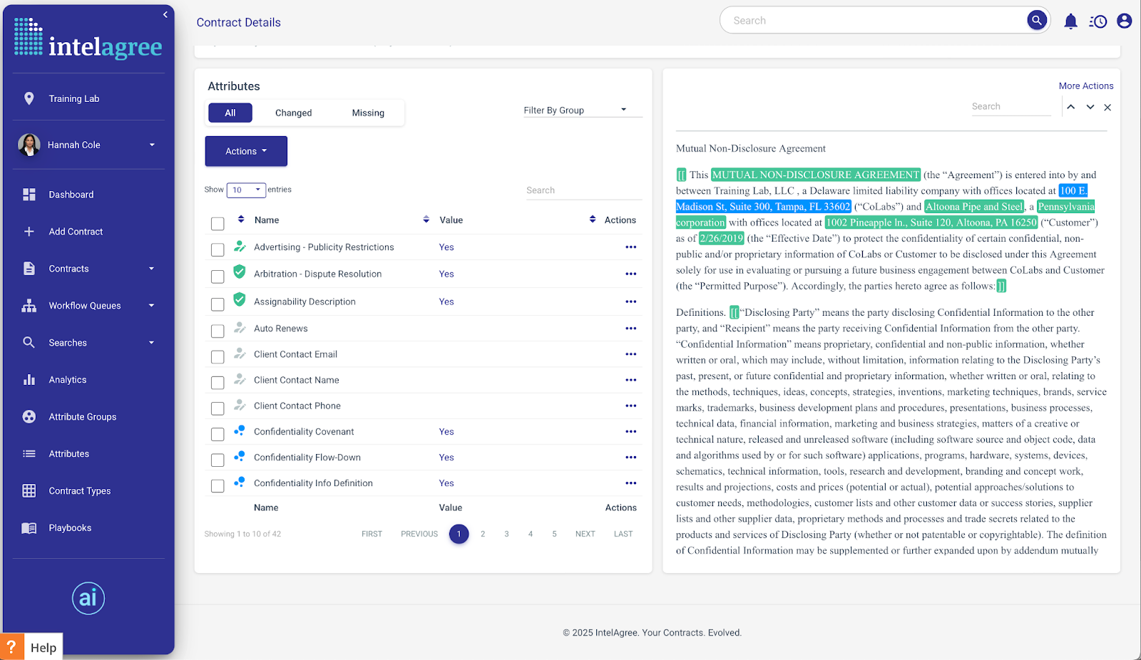 L'une des caractéristiques remarquables d'IntelAgree est ses capacités d'apprentissage automatique, qui facilitent l'identification, l'extraction et l'analyse des termes et clauses critiques. Les utilisateurs peuvent exploiter des modèles intégrés ou en créer des personnalisés adaptés à leurs besoins spécifiques, accélérant ainsi considérablement le processus de négociation. Cette fonctionnalité améliore non seulement l'efficacité mais réduit également la probabilité d'erreurs pouvant survenir lors des examens manuels.