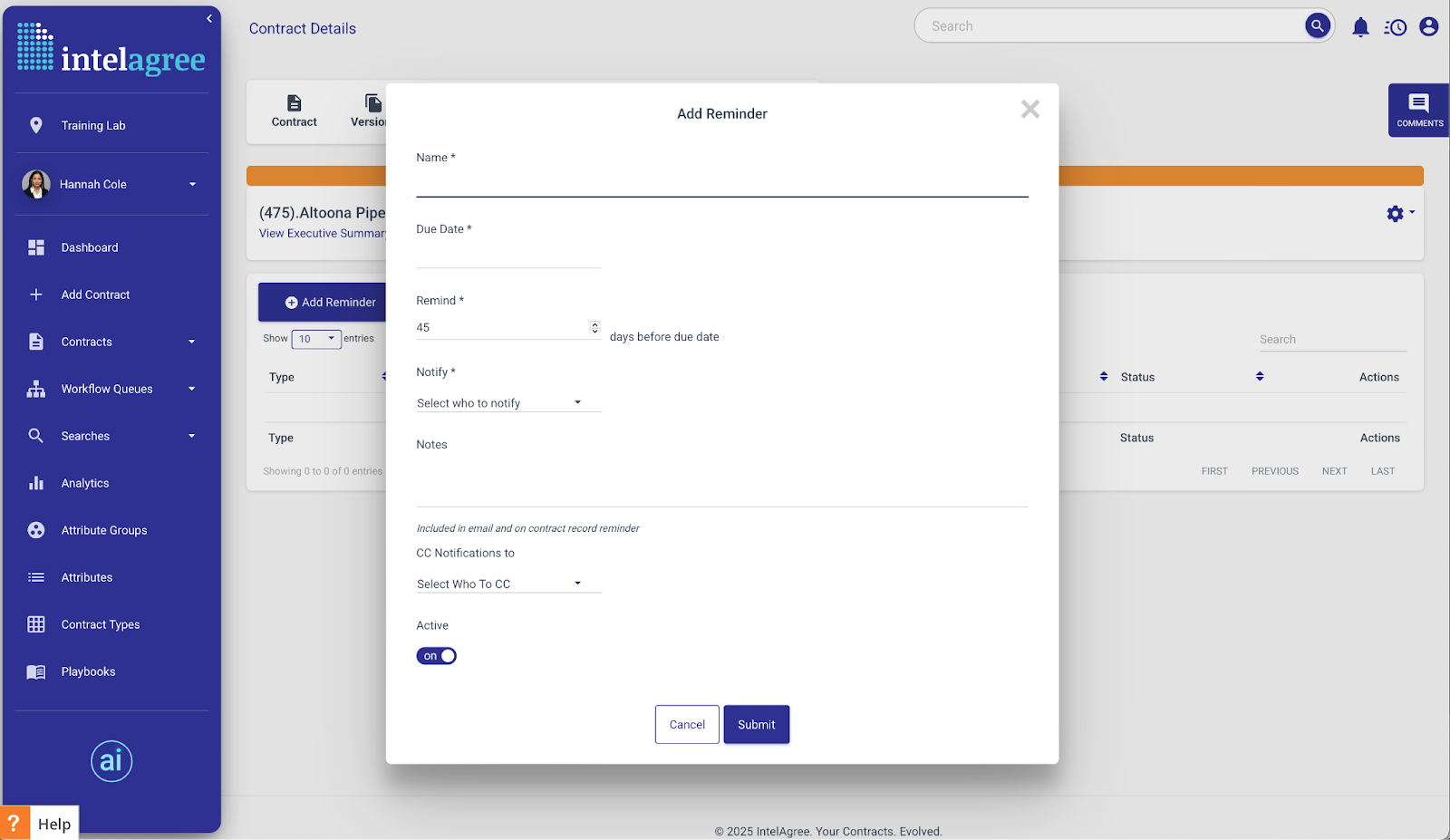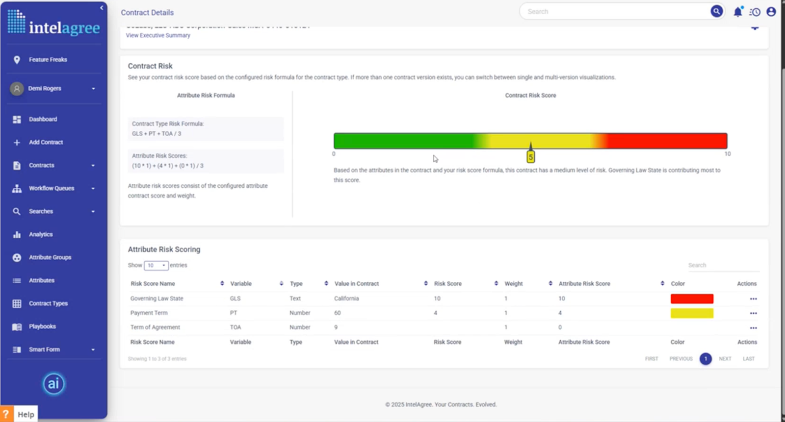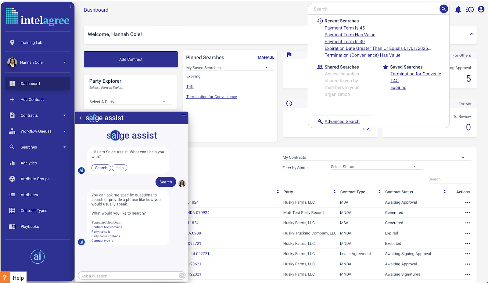 De plus, IntelAgree intègre une automatisation intelligente des flux de travail, qui fournit des informations en temps réel sur le statut des contrats tout au long de leur cycle de vie. Les utilisateurs peuvent facilement suivre si un contrat est en attente d'approbations internes, en négociation, bloqué ou en attente de signatures. Ce niveau de visibilité garantit que les équipes restent informées et peuvent agir rapidement pour résoudre tout problème pouvant survenir, minimisant ainsi les retards et améliorant la productivité globale.