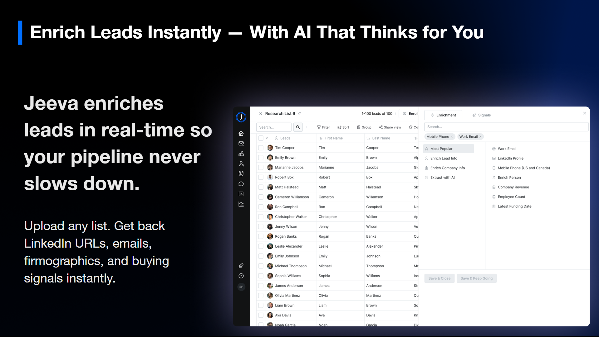 ✔ Découverte et enrichissement des leads : Jeeva AI est une option de premier plan pour la génération et l'enrichissement de leads car il offre des leads qualifiés avec des emails confirmés, des profils LinkedIn, des signaux d'achat et des firmographics grâce à des filtres alimentés par l'IA et plus de 50 sources de données.
