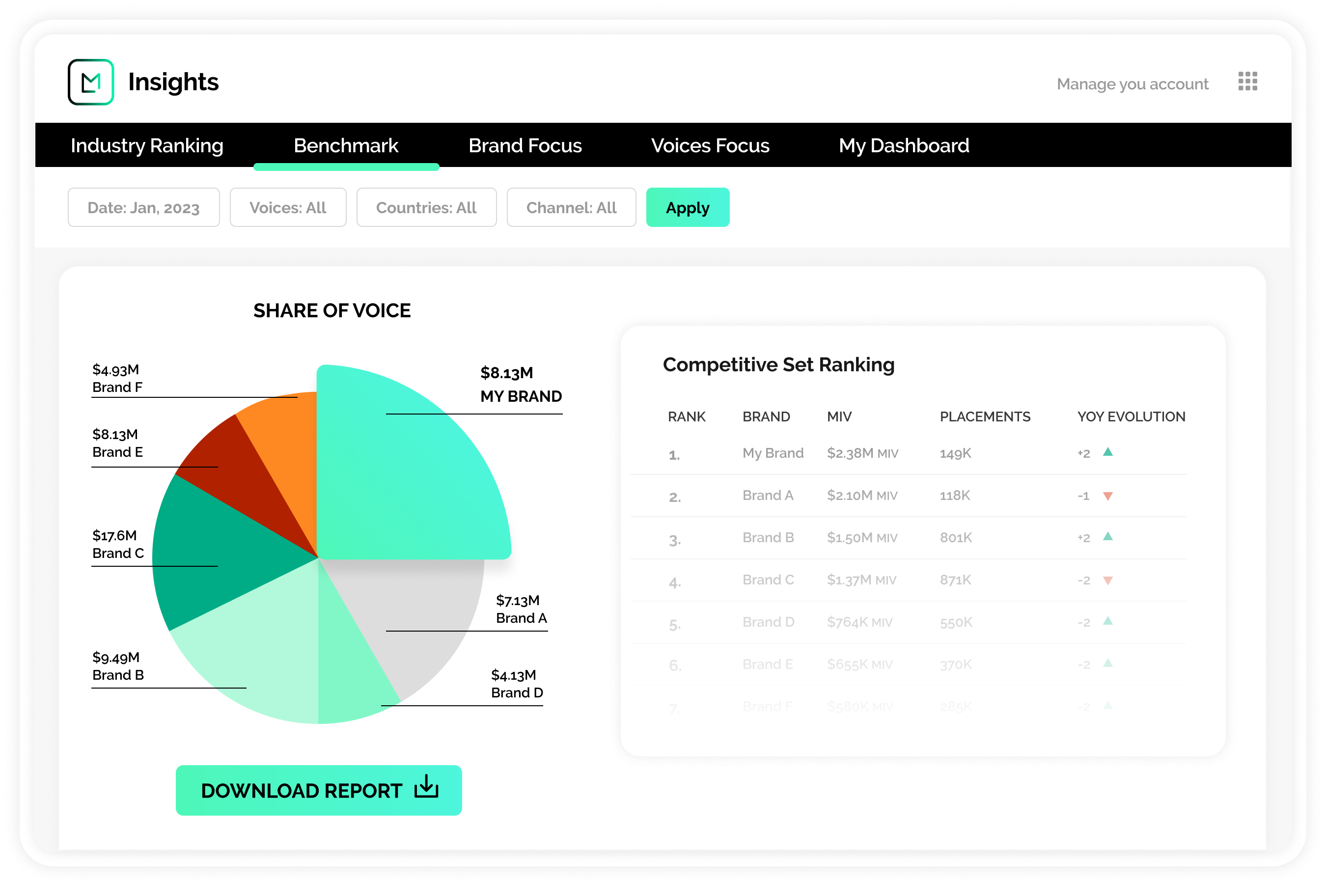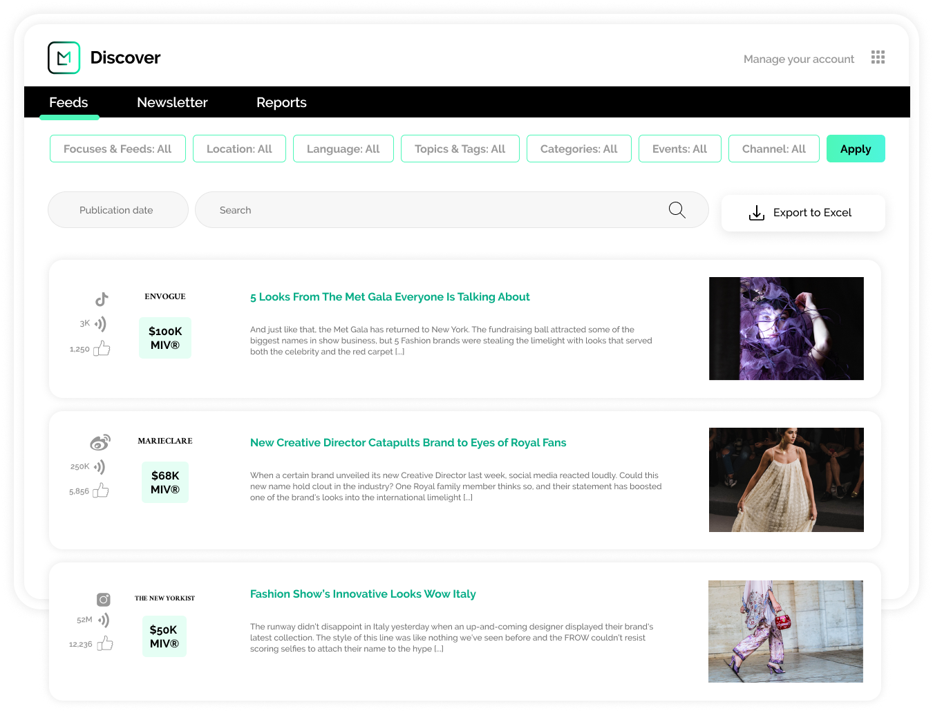 Media Impact Value® (MIV®) permet aux marques d'attribuer une valeur monétaire à chaque publication, interaction ou article pour mesurer son impact et identifier les contributions à la performance de la marque à travers les Voix, les canaux et les régions. Reconnu comme la norme de mesure la plus complète et moderne de l'industrie, MIV® vous permet de comparer et de comprendre quelles stratégies créent le plus d'impact médiatique à travers l'imprimé, en ligne et les réseaux sociaux en reflétant la perspective du public. La méthodologie de Launchmetrics est construite sur plus de 15 ans d'expérience, travaillant avec et pour des marques de mode, de style de vie et de beauté (FLB) à l'échelle mondiale, y compris en Chine. Finement ajusté avec l'IA et l'apprentissage automatique, l'algorithme repose sur des attributs à la fois quantitatifs et qualitatifs spécifiques aux industries FLB (y compris l'engagement du public, la pertinence de l'industrie, l'autorité de la source et la qualité du contenu) pour assurer une précision et une pertinence globales lors de l'évaluation dans le paysage concurrentiel en croissance.