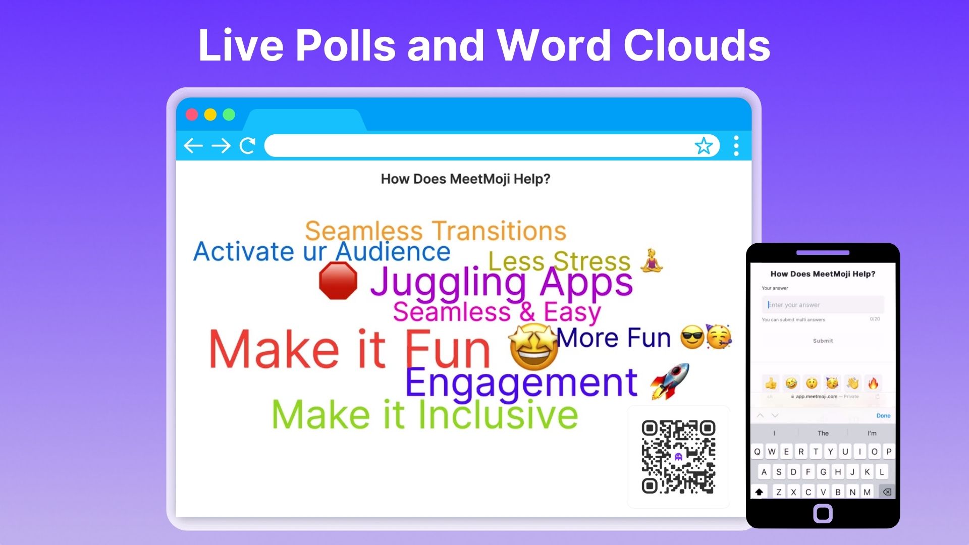 Ajoutez facilement à vos présentations. Pendant votre présentation, cliquez sur l'icône et faites participer votre public en scannant un code QR ou en visitant meetmoji.com/go et en entrant un code.