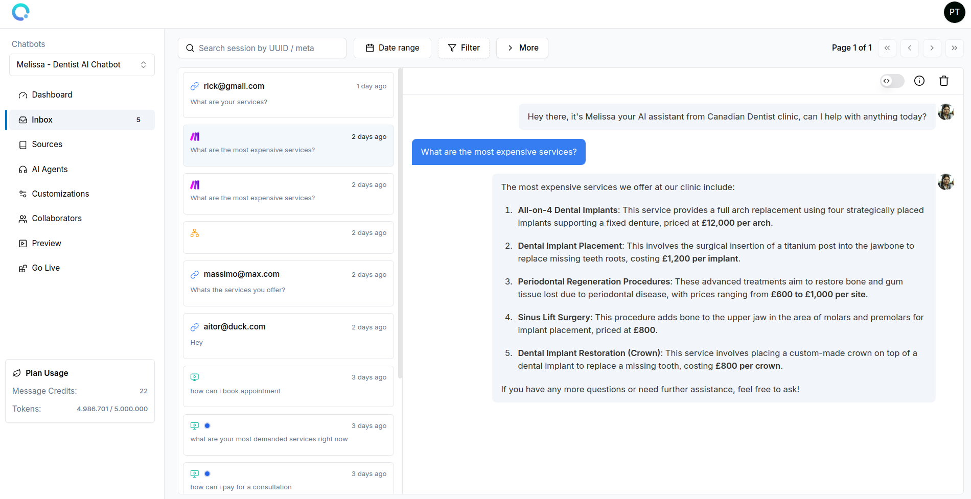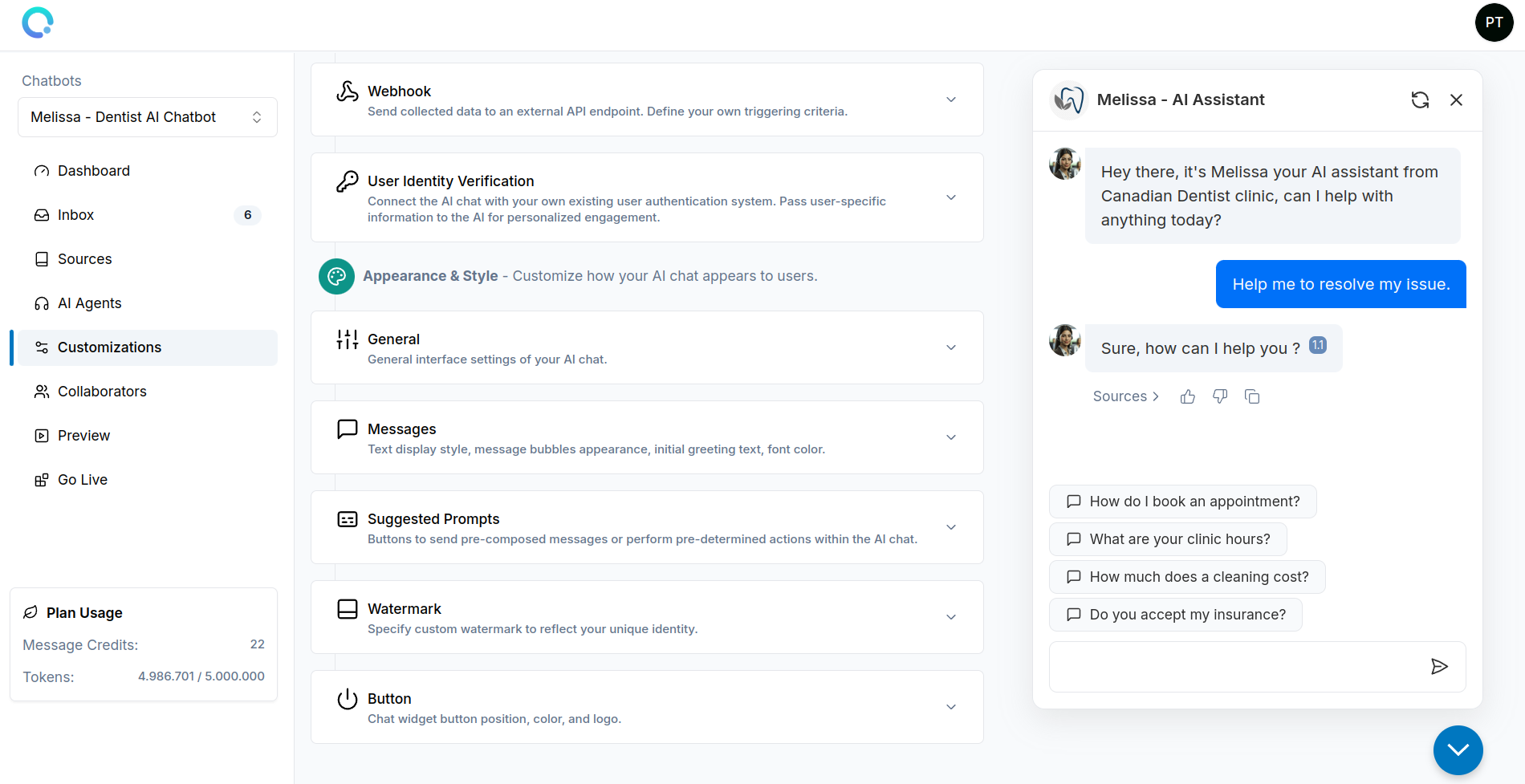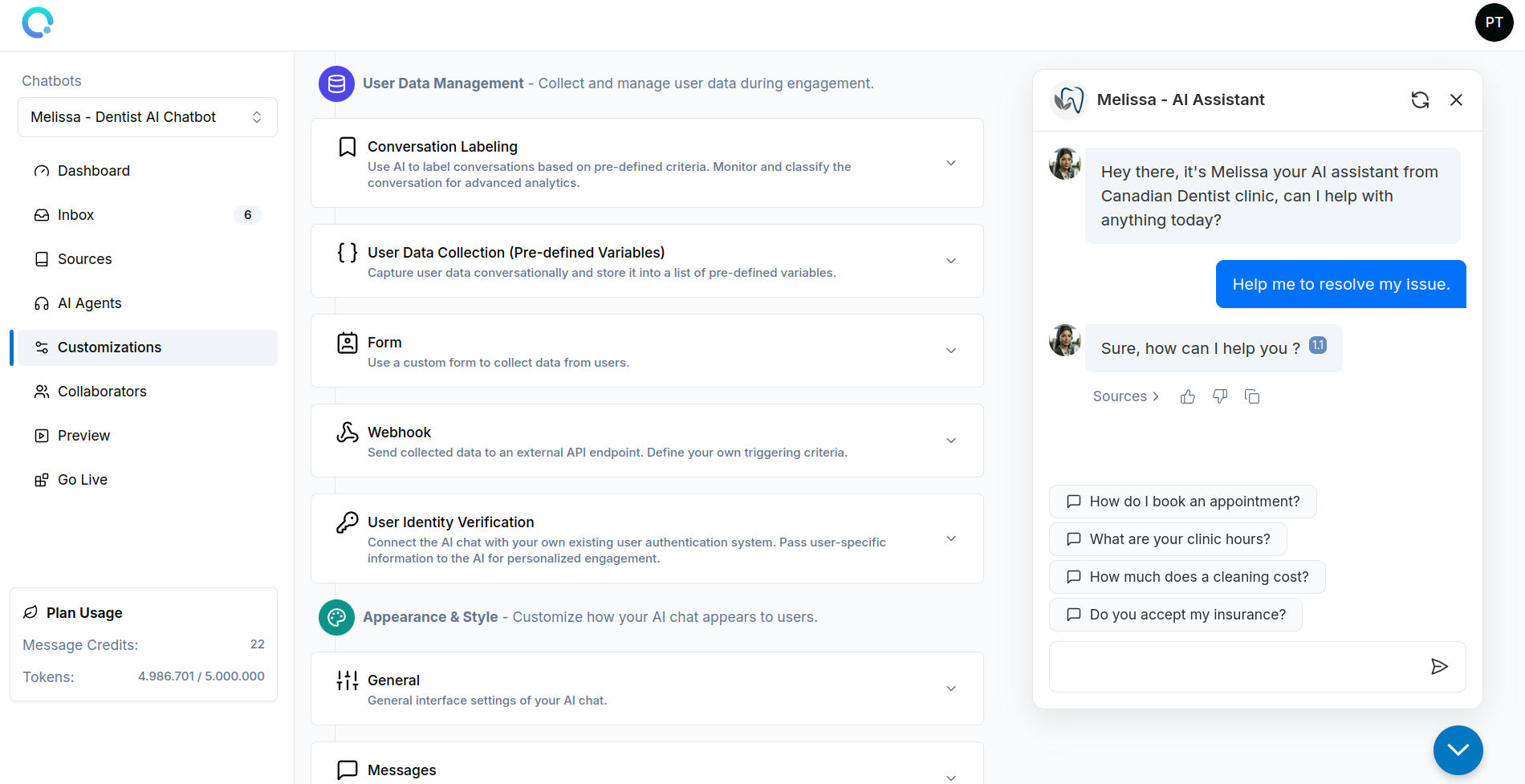 Tidio est une plateforme de support client tout-en-un qui inclut le suivi des problèmes du service d'assistance, le chat en direct, l'automatisation des chatbots (Flows) et un agent de service client IA (Lyro). La plateforme permet aux entreprises de gérer toutes les communications avec les clients depuis un tableau de bord unique, y compris les e-mails et les canaux de médias sociaux comme WhatsApp, Messenger et Instagram. Le widget interactif de Tidio fonctionne à la fois comme un plugin de chat en direct et un chatbot. Avec Flows, les entreprises peuvent créer des automatisations personnalisées de type chatbot pour fournir automatiquement des réponses aux messages entrants, offrir du support et générer des prospects. De plus, Lyro utilise votre base de connaissances et vos FAQ pour fournir des réponses et des solutions précises, utiles et naturelles dans le ton unique de votre marque. Lyro peut atteindre un taux de résolution allant jusqu'à 64 %, permettant à votre équipe de se concentrer sur des problèmes plus complexes.