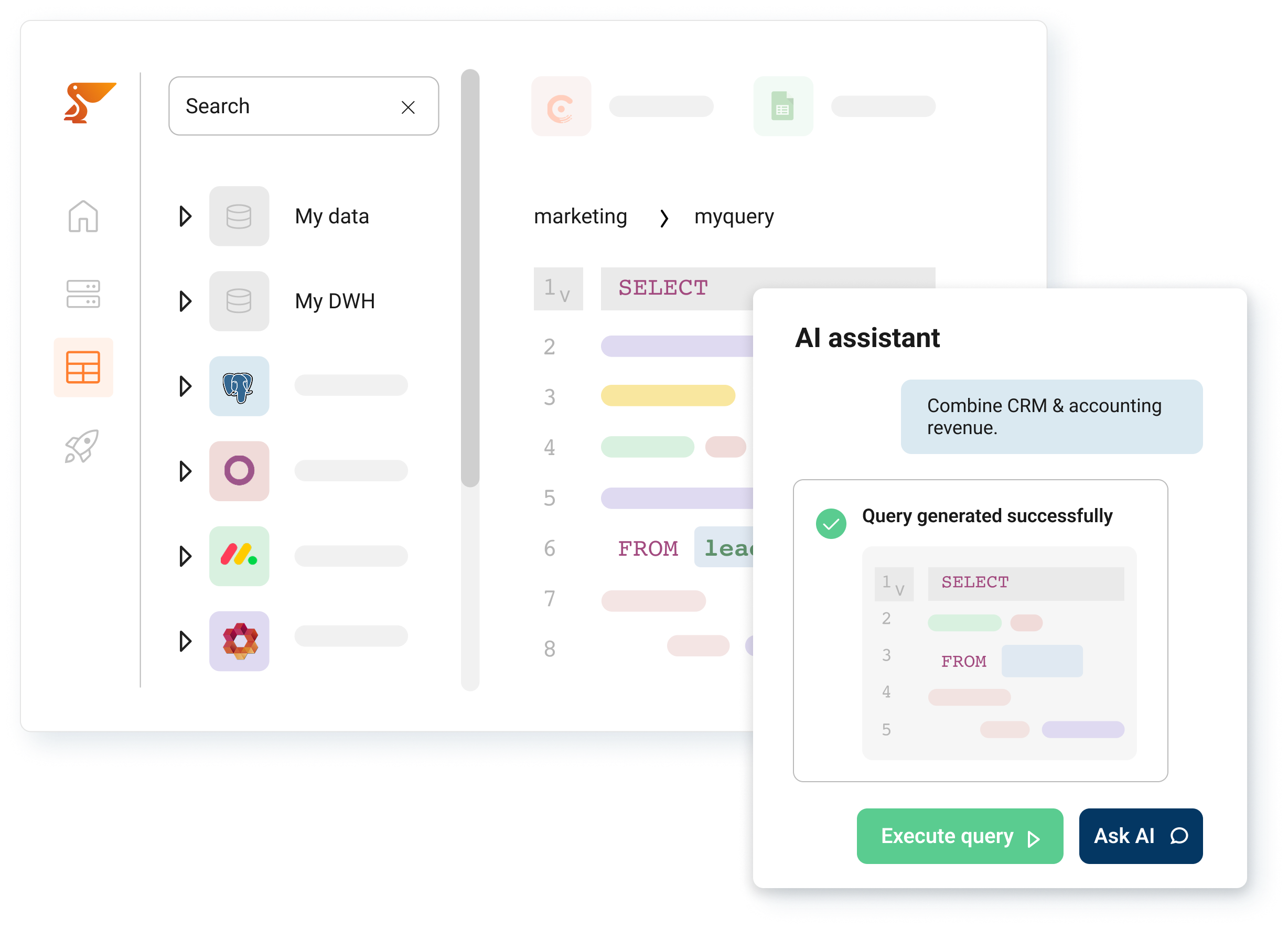 Les analystes et les utilisateurs avancés peuvent utiliser l'éditeur SQL avancé de Peliqan avec le support d'un assistant IA pour transformer les données et préparer des ensembles de données prêts à l'emploi, qui peuvent être utilisés dans n'importe quel outil BI tel que Microsoft Power BI, Metabase, Tableau, Qlik, Looker, etc. Les utilisateurs peuvent également configurer des flux ETL inversés.