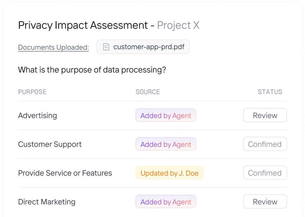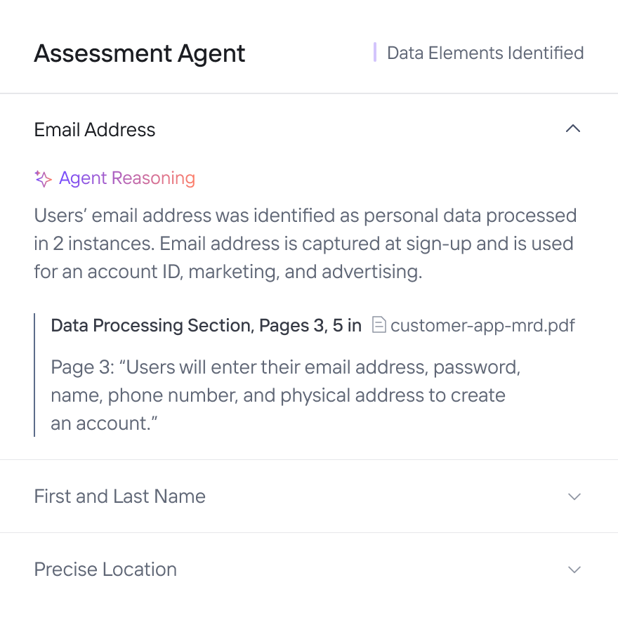 - Évaluations des risques de confidentialité : Réalisez des évaluations des risques de confidentialité et des flux de travail de mitigation avec des outils assistés par l'IA qui capturent le contexte commercial, identifient de manière proactive les risques et rationalisent les efforts de mitigation.