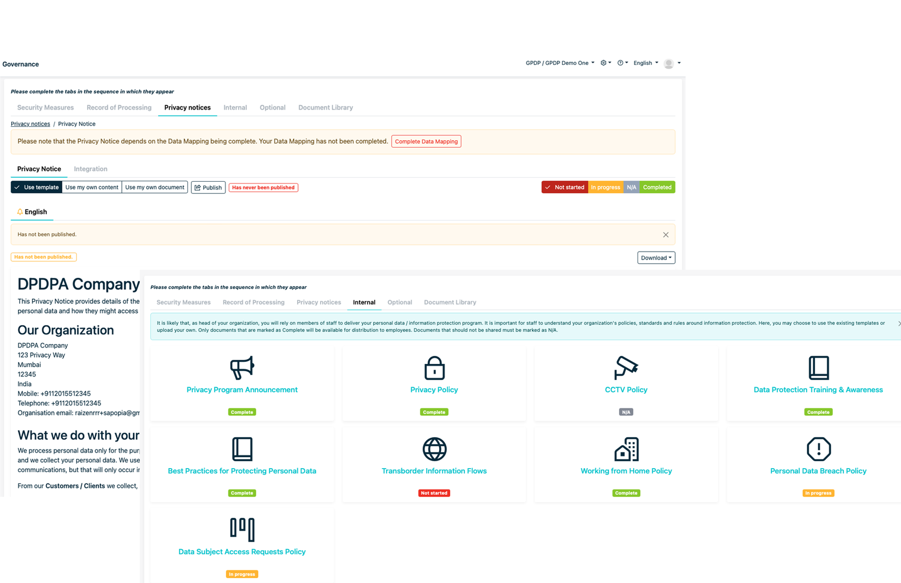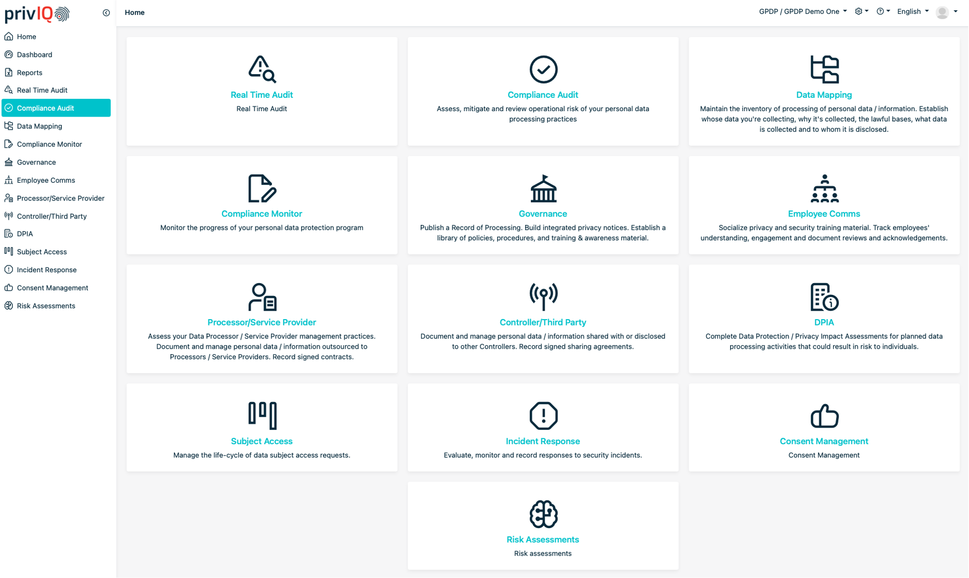Cette plateforme facile à utiliser est conçue pour les responsables de la protection des données, les équipes de conformité, les consultants et les dirigeants d'entreprise qui ont besoin de plus que des listes de contrôle statiques. Elle offre la visibilité, les flux de travail et les rapports nécessaires pour aller au-delà de la conformité réactive et établir un programme proactif qui renforce à la fois l'efficacité opérationnelle et la confiance.