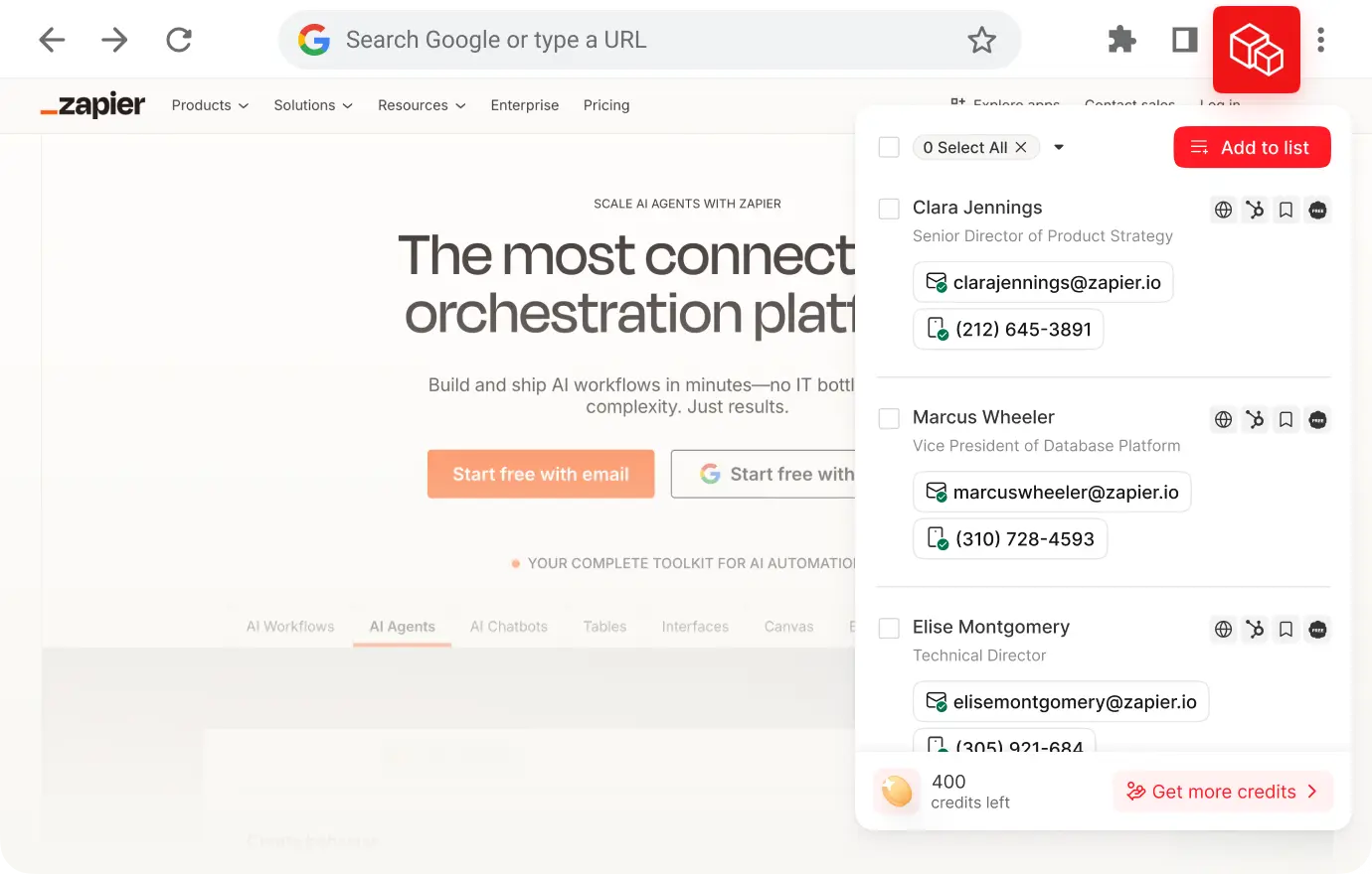 Prospection et création de listes : Outils pour rechercher, filtrer et exporter des listes de prospects ciblées en quelques secondes. Une extension Chrome capture les données de contact vérifiées directement depuis LinkedIn, les sites web d'entreprises, GitHub et Twitter sans quitter le navigateur.