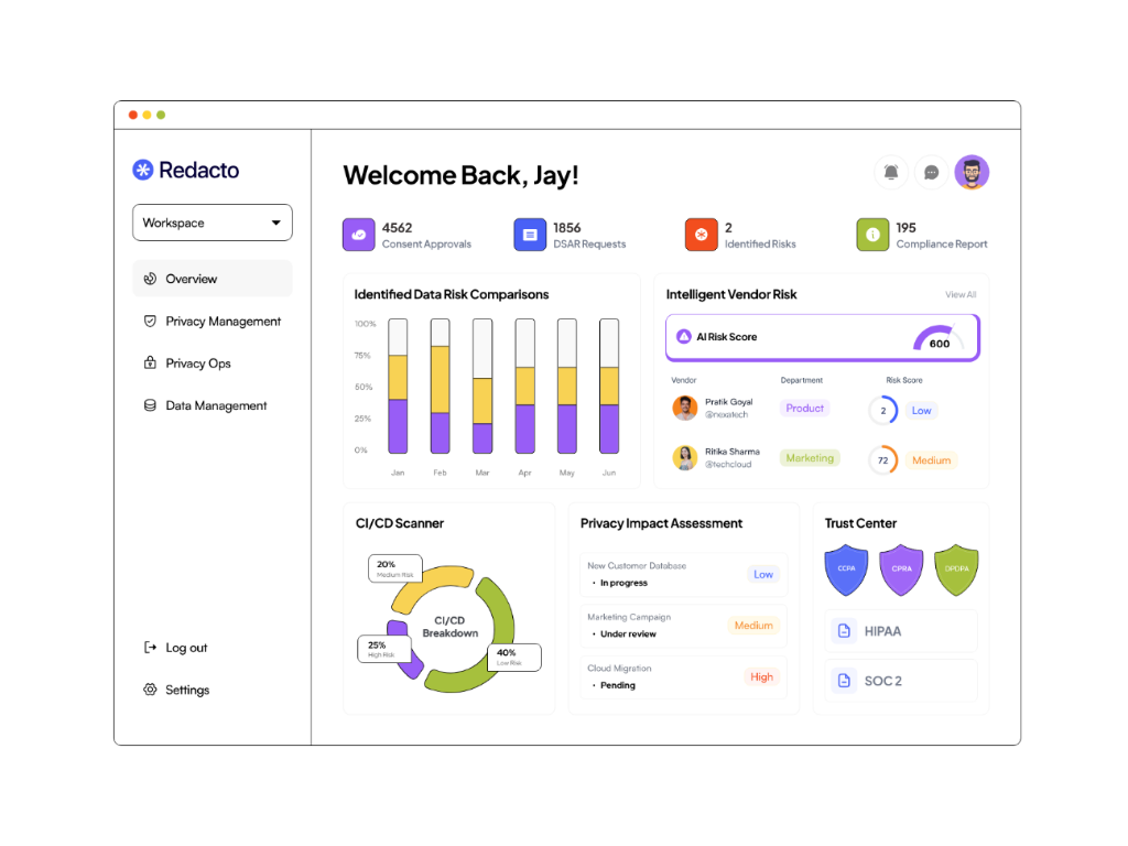 - Gestion des risques de confidentialité des fournisseurs : Centralisez les inventaires des fournisseurs et utilisez des évaluations pilotées par l'IA pour rationaliser l'intégration des fournisseurs, économisant du temps et des coûts tout en atténuant les risques.