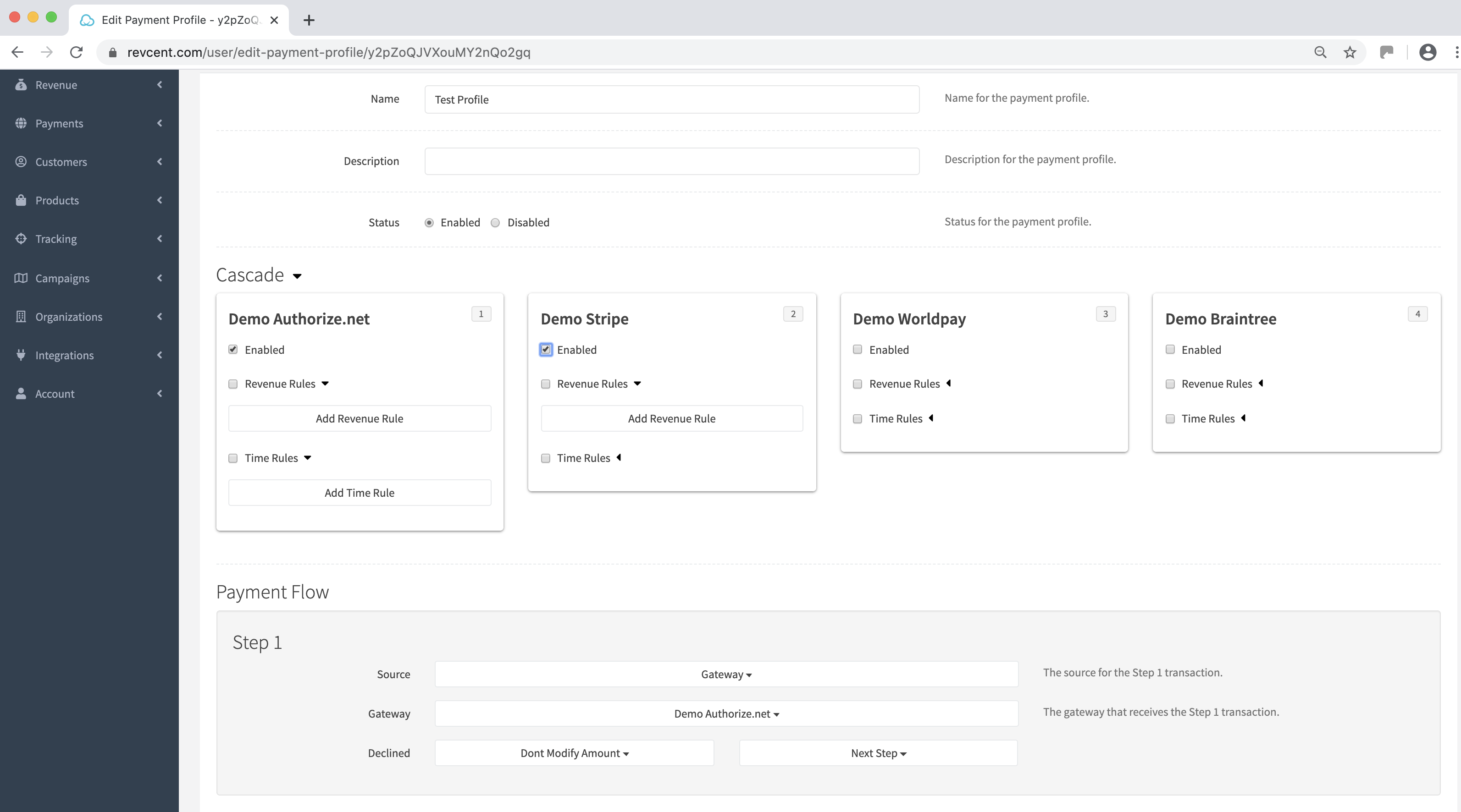 Gestion des processeurs de paiement : RevCent vous permet de créer des profils de paiement pour intégrer plusieurs processeurs de cartes, et d'autres méthodes de paiement comme PayPal ou les chèques. Sauvez les paiements échoués avec l'outil Decline Salvage de RevCent ou sauvez-les en temps réel avec les paramètres de cascade de paiement. Pour les acheteurs à la recherche de bonnes affaires, RevCent dispose également d'outils robustes de coupons et de remises.
