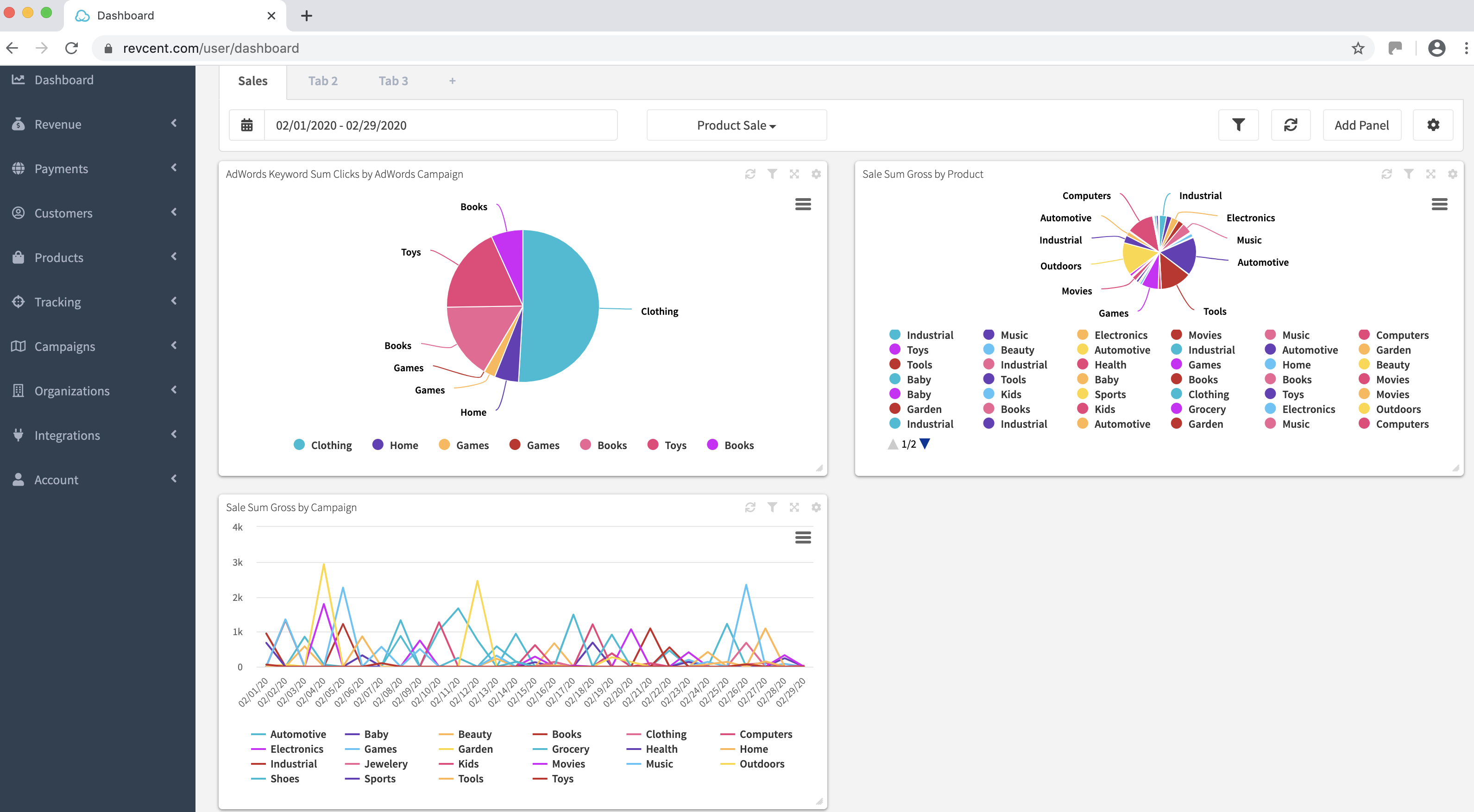 Suivi des visiteurs et des commandes : Collez un extrait de code sur vos domaines marketing et votre site monétaire, pour obtenir un suivi approfondi et inter-domaines de vos visiteurs. RevCent s'intègre même directement à votre compte Google AdWords, pour fournir des données AdWords détaillées sur chaque vente. Le suivi des métadonnées personnalisables étend encore plus les informations exploitables que RevCent peut vous fournir.