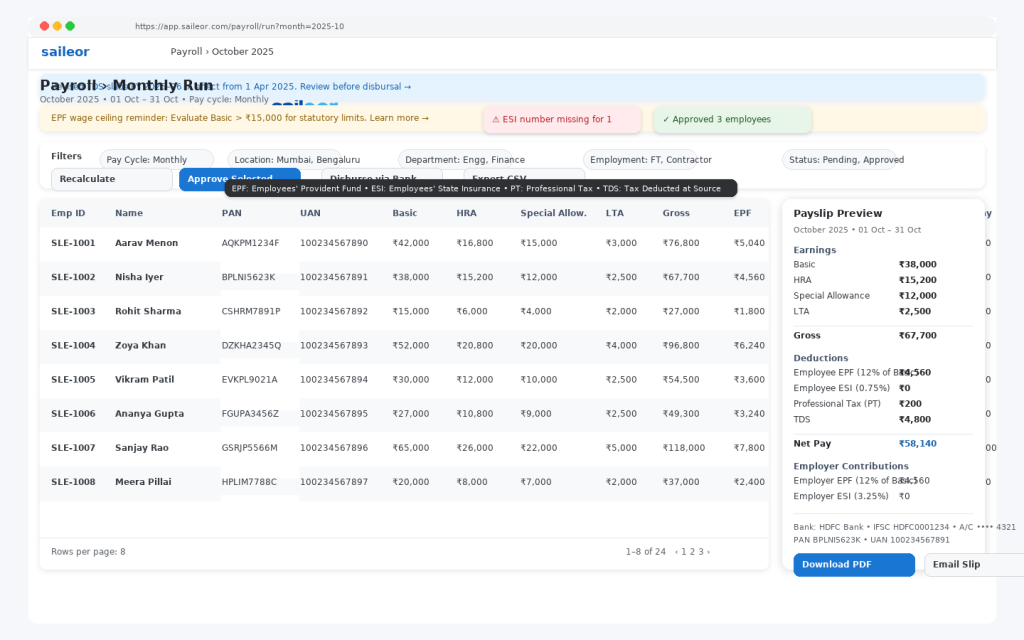 Ce qui distingue Saileor, c'est notre expertise axée sur l'Inde et notre compréhension approfondie des réglementations locales en matière de RH, de paie et de travail. De la gestion de l'EPF, de l'ESIC, du PT et du LWF à la TDS, au formulaire 24Q et aux contrats de travail, chaque point de conformité est traité avec précision, rapidité et transparence. Notre plateforme et nos processus sont spécifiquement conçus pour le marché indien, offrant aux employeurs mondiaux l'assurance que leur main-d'œuvre est gérée selon les normes les plus élevées.