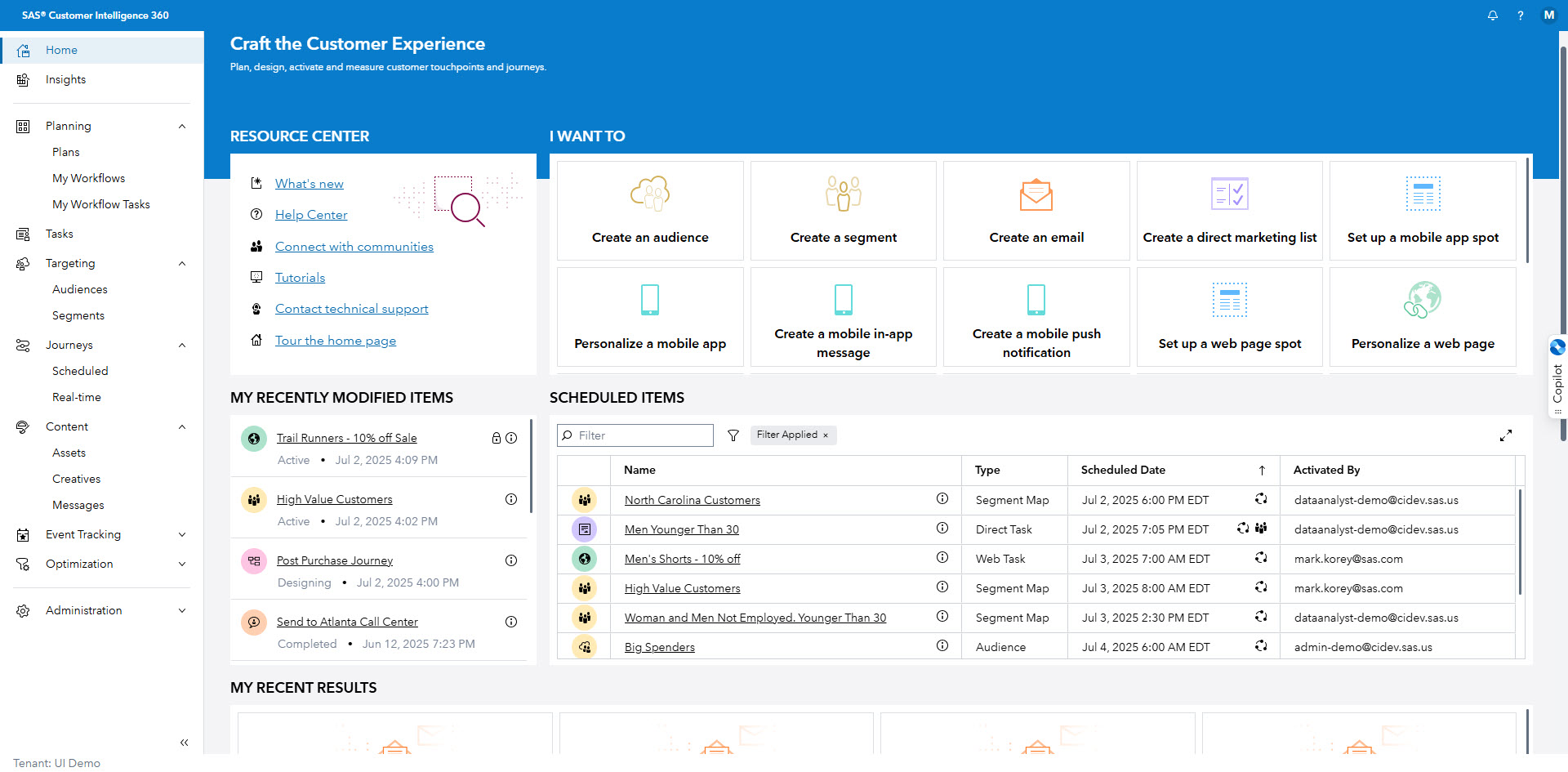 SAS Customer Intelligence 360 est une plateforme d'engagement client sophistiquée conçue pour aider les marketeurs à transformer les insights en stratégies actionnables qui favorisent des expériences client fluides et personnalisées. Cette plateforme sert de solution complète pour les entreprises cherchant à améliorer leurs efforts marketing en allant au-delà des systèmes MarTech obsolètes. En permettant des interactions sur mesure qui répondent aux besoins des clients en temps réel, SAS Customer Intelligence 360 permet aux organisations de s'engager efficacement avec leur audience.