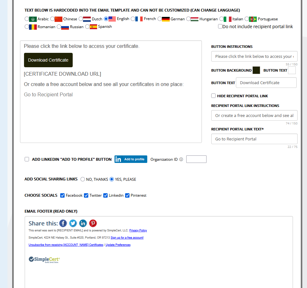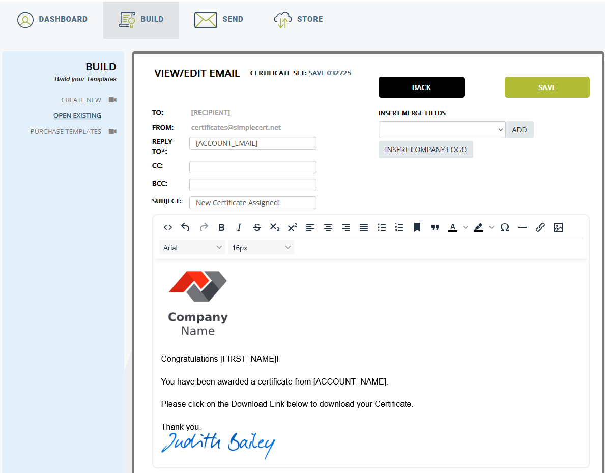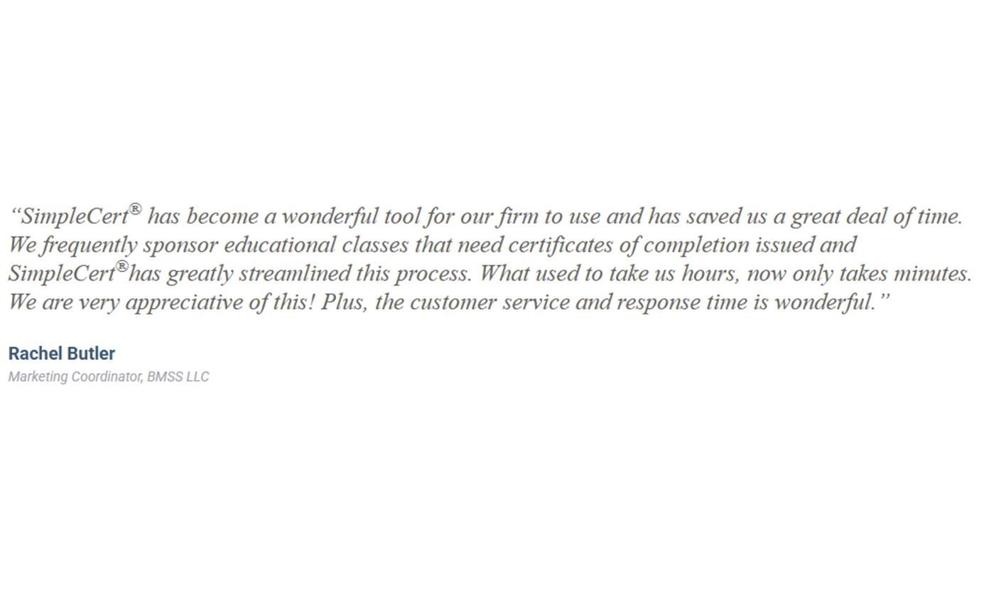Du processus de démonstration, en passant par l'intégration et la formation, jusqu'à l'utilisation quotidienne et le support, SimpleCert a grandement aidé le personnel à rendre le processus de génération et de distribution des certificats beaucoup plus simple et plus efficace. Ils ont travaillé avec nous pour personnaliser le processus pour notre cas d'utilisation spécifique et, sur la base de nos rapports post-événement, pour transférer facilement les données de nos rapports vers le modèle de certificat SimpleCert et les télécharger. Ils ont collaboré avec notre département informatique pour intégrer leur plateforme à notre système de messagerie afin de personnaliser le processus de distribution. Le support client est à un simple email et nous avons maintenant des modèles de certificats en libre-service pour couvrir tous nos besoins événementiels. Une équipe formidable avec laquelle travailler et un excellent produit. Je recommande vivement ! Avis collecté par et hébergé sur G2.com.