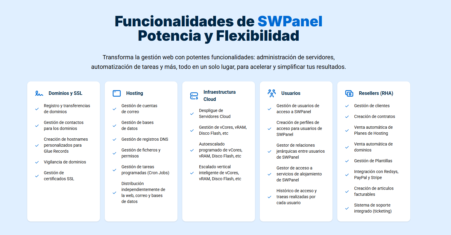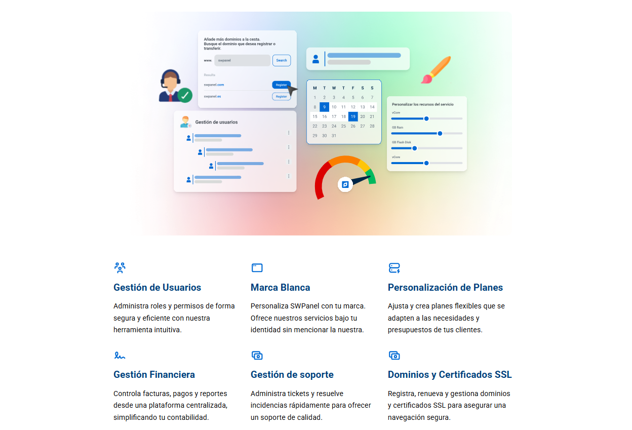 SWPanel est une plateforme innovante et robuste, conçue pour offrir une gestion intégrale des services d'hébergement, d'infrastructure, de sécurité, de pare-feu et de mise en réseau*, des rapports administratifs, la gestion des revendeurs, le module RHA** et les connexions au service, le tout depuis une interface unique.