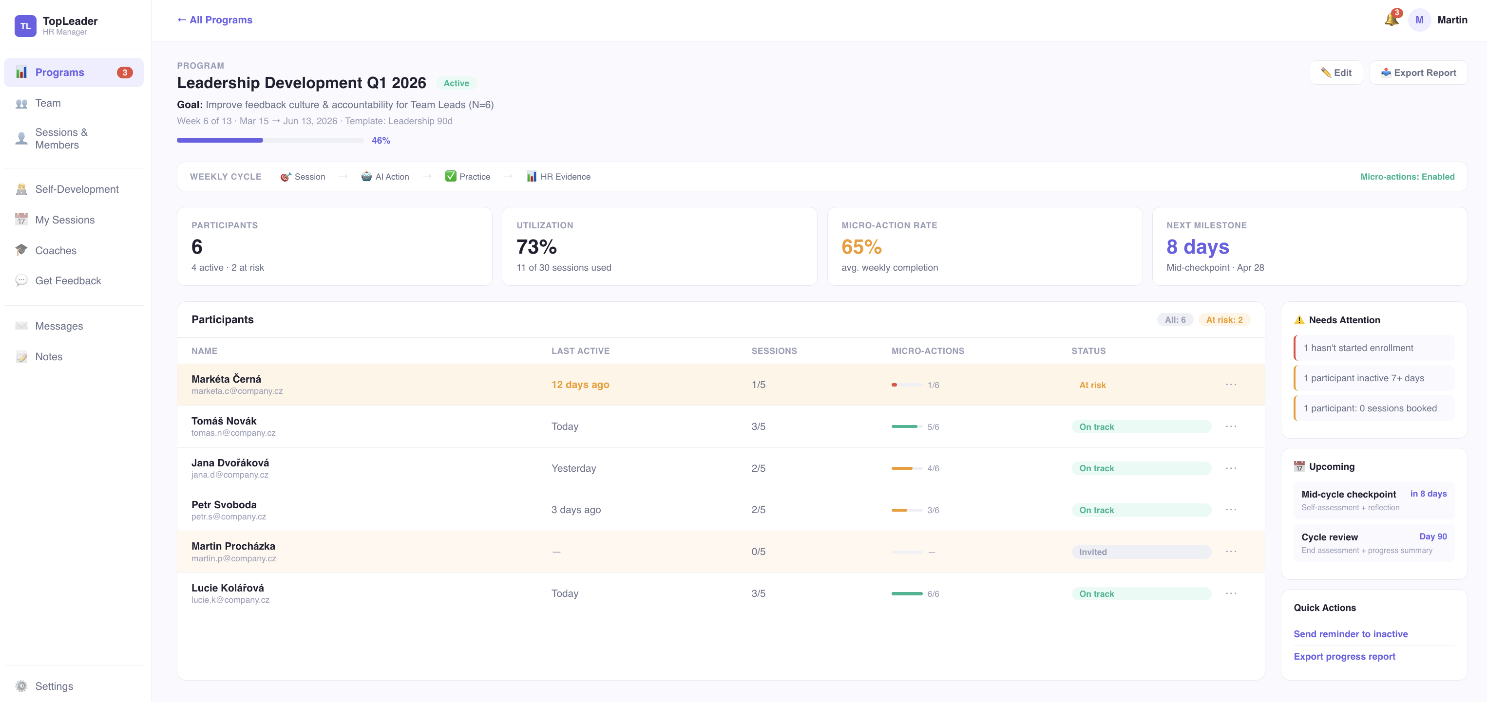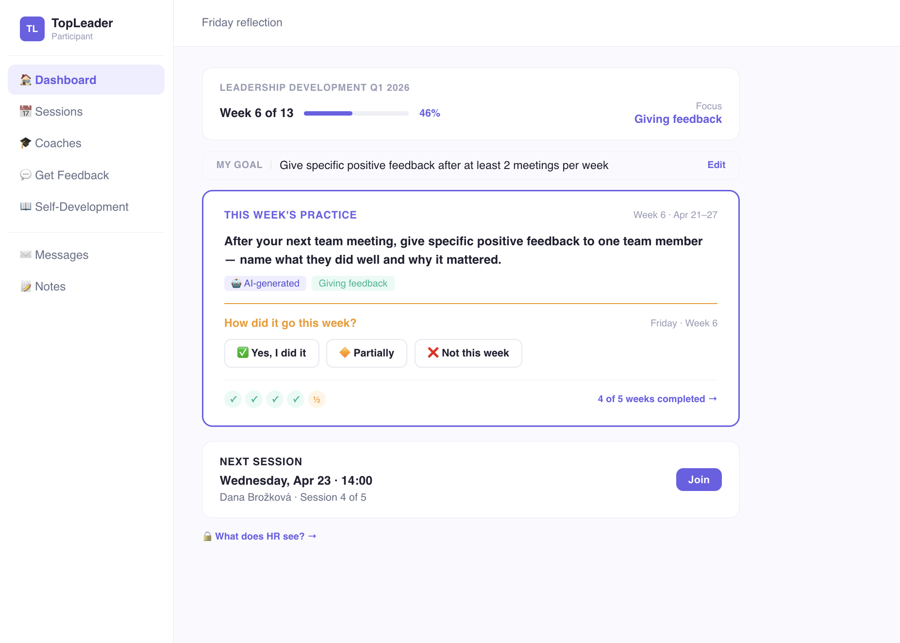 J'ai rencontré de nombreux outils de coaching numérique, mais Top Leader se distingue vraiment en mettant d'abord l'accent sur le parcours utilisateur tout en conservant une véritable profondeur technique. Il crée un espace où les coachs et les leaders peuvent rester concentrés sur ce qui compte le plus : la transformation. Avis collecté par et hébergé sur G2.com.