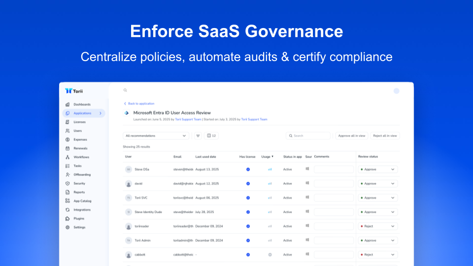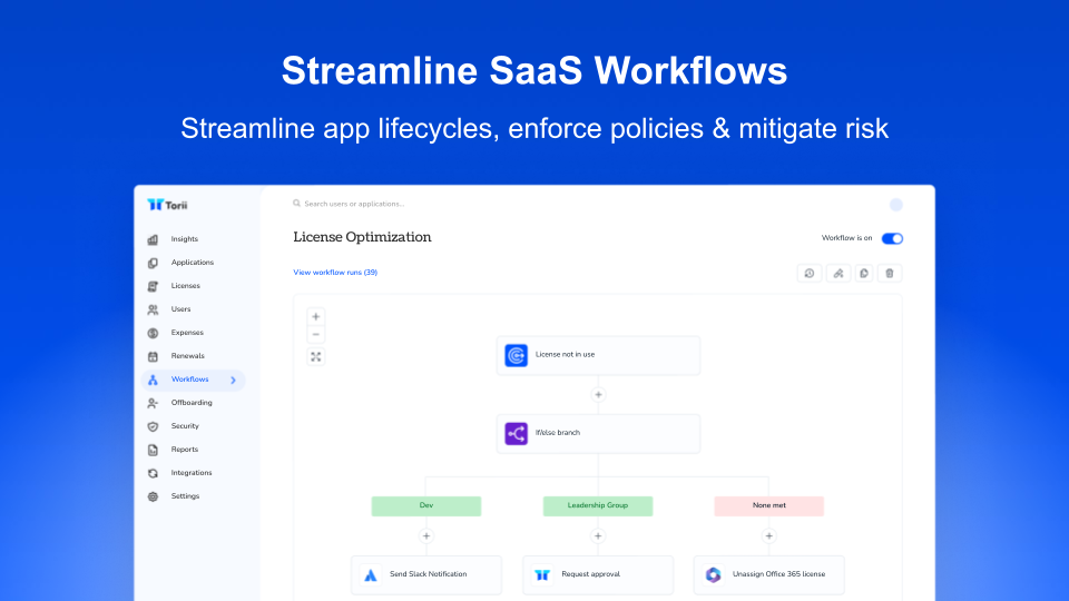 De plus, nous exploitons les flux de travail au sein de Torii pour faire apparaître des alertes lorsque de nouvelles applications sont découvertes ou lorsque l'utilisation d'une application précédemment fermée ou restreinte est détectée. Cela nous permet d'agir rapidement pour déterminer la réponse appropriée. Nous utilisons également des flux de travail pour rationaliser l'intégration et le départ. Cela rend non seulement le processus plus rapide et plus facile, mais nous fournit également une piste d'audit des actions effectuées et si elles ont réussi ou non.