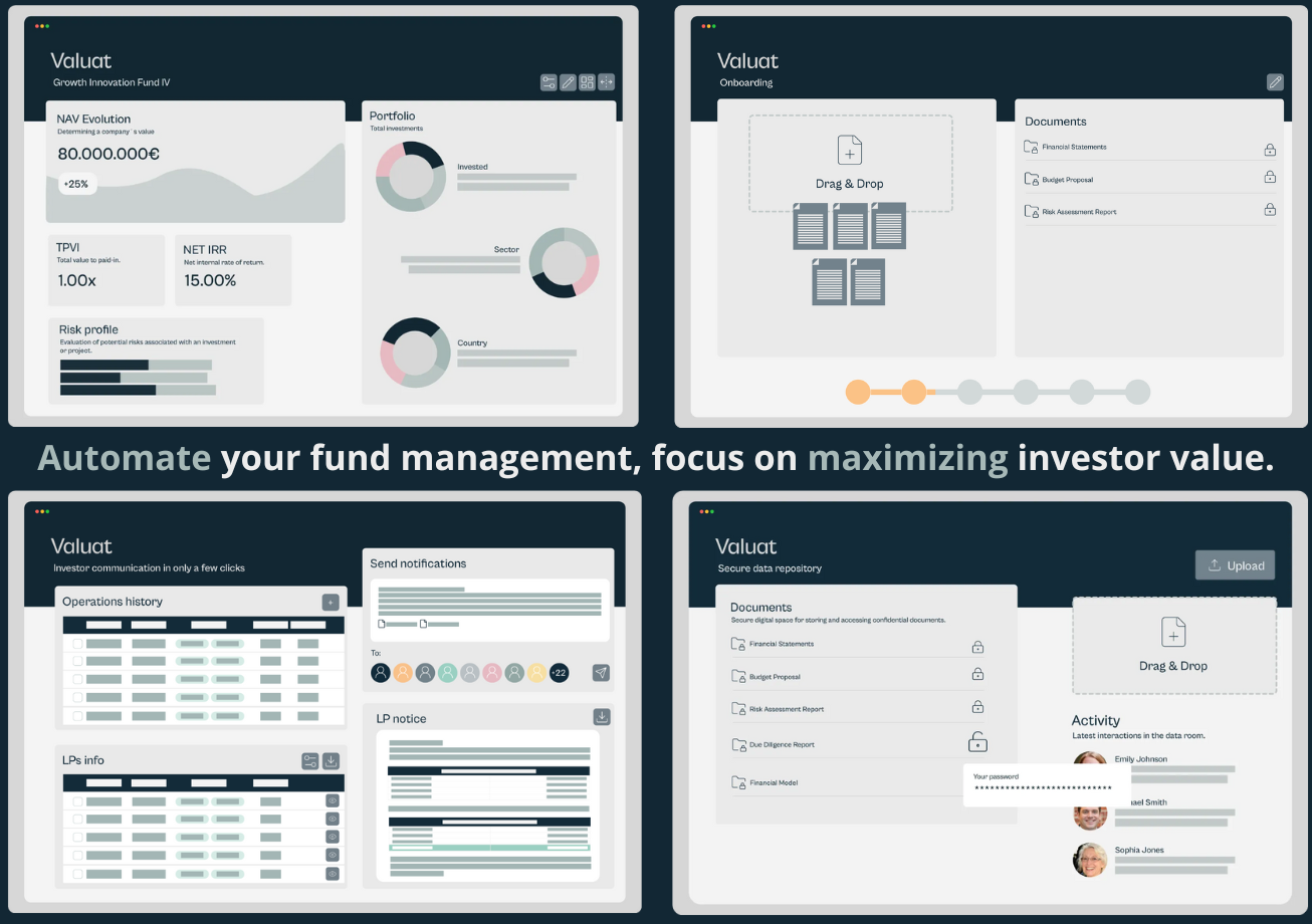Valuat est la plateforme tout-en-un d'administration de fonds et de digitalisation pour les gestionnaires de Private Equity et de Capital Risque. Nous rationalisons et automatisons les processus critiques tels que l'intégration et les vérifications KYC/AML, l'administration de fonds, le reporting et les relations avec les investisseurs (LP).